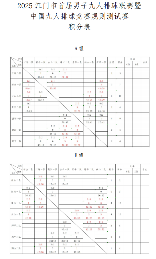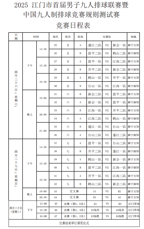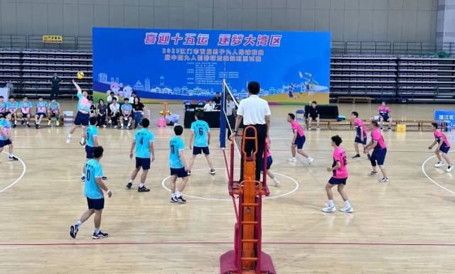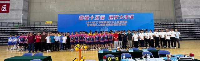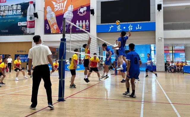 由江门市“百千万工程”指挥办、江门各区(市)人民政府、江门市文化广电旅游体育局主办,台山市文化广电旅游体育局承办,蓬江、江海、新会、开平、鹤山、恩平等区(市)文广旅游体育局协办,珠江文体台山分公司运营执行的“喜迎十五运,逐梦大湾区”2025江门市首届男子九人排球联赛暨中国九人制排球竞赛规则测试赛于4月19日下午正式鸣哨开幕。