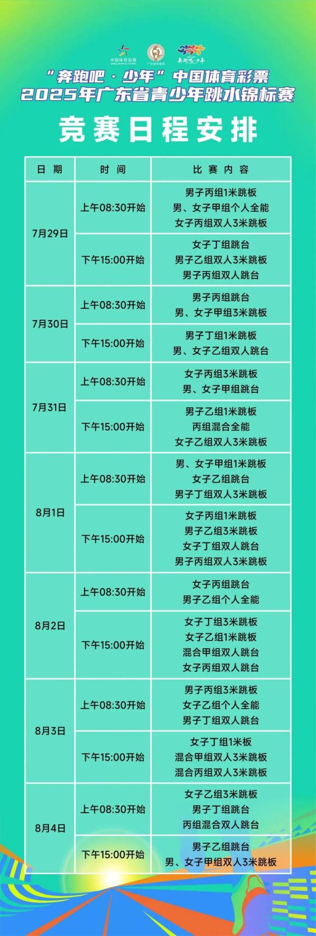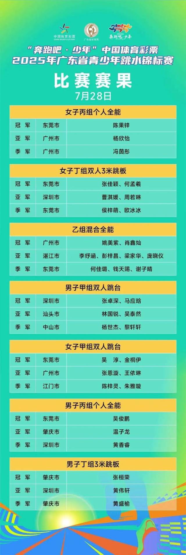 首日赛事聚焦全能争锋与双人默契,上午进行了女子丙组个人全能、女子丁组双人3米跳板、乙组混合全能;下午进行了男、女子甲组双人跳台、男子丙组个人全能、男子丁组3米跳板决赛。