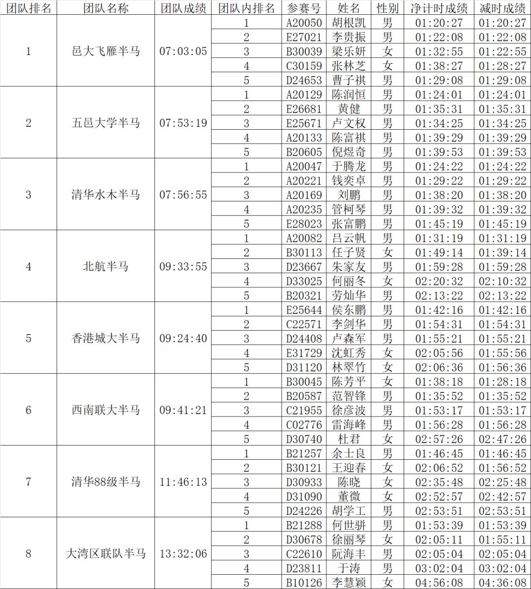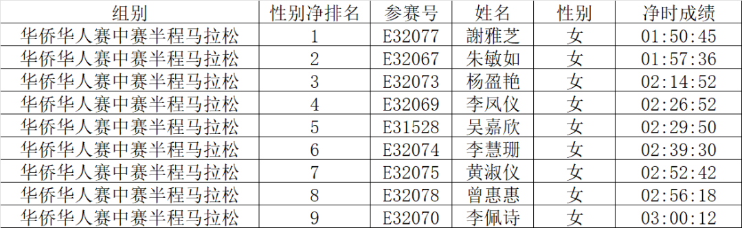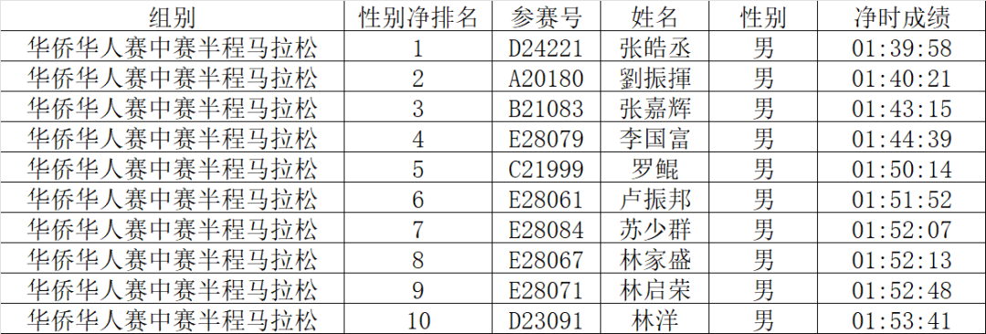 (二)半程马拉松男、女(净计时)前十名将获得以下奖励(单位:人民币)