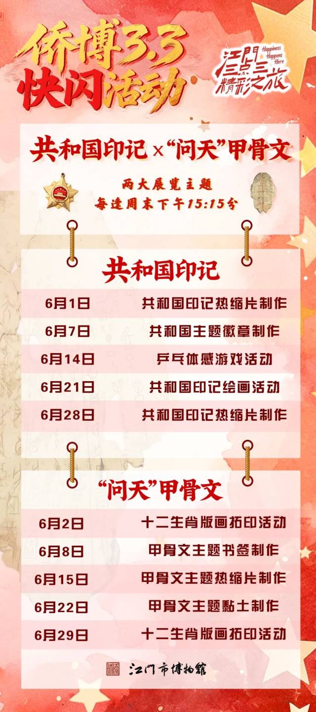 这个6月,中国侨都华侨华人博物馆上新了!每逢节假日下午15:15准时开启 “共和国印记+甲骨文”主题手作快闪,10场沉浸式文化体验,带你用双手感受中华文明脉络。