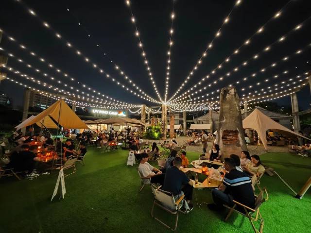 在这里,无需翻山越岭,天幕、露营椅、大荧幕、小吧台和一份份夜市小吃、冰爽饮品,就能让你感受到,这座城市的专属夜趣。