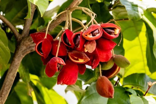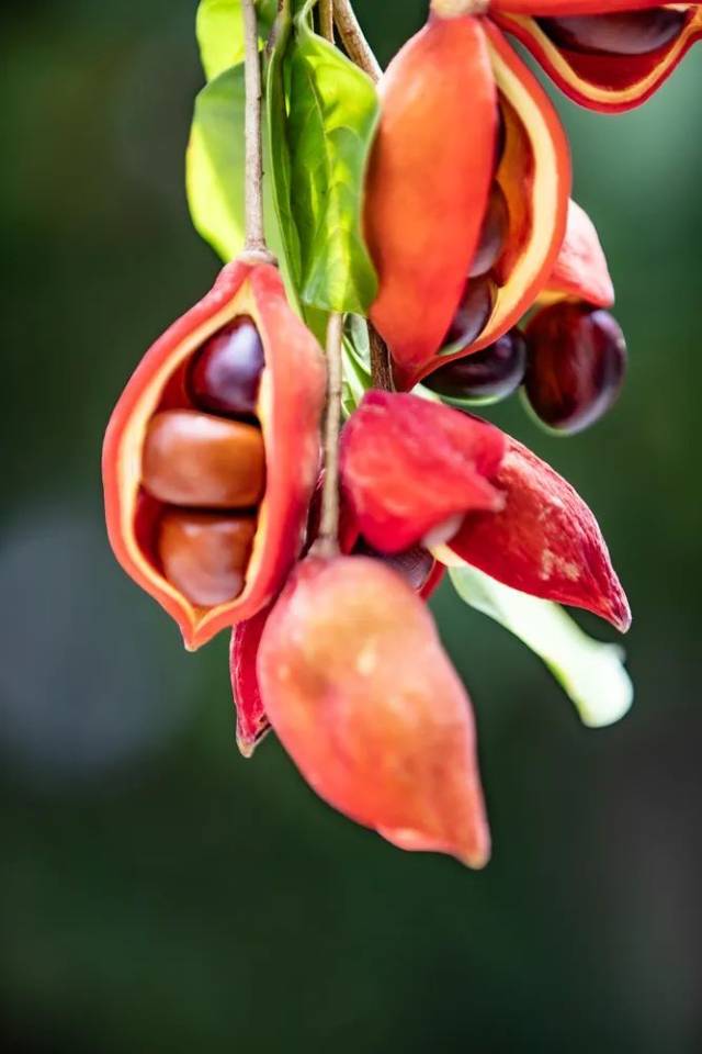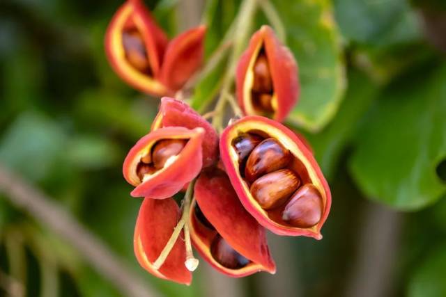 苹婆,属梧桐科的一种植物,初夏开花,每年七、八月份会结出红色的大果子,而成熟的苹婆果子又会分裂成四五个分果,外面暗红色,内面为黑褐色的椭圆球形种子。因远看酷似眼睛,而且那黑褐色的种子又可以食用,故民间又俗称其果实为“凤眼果”。