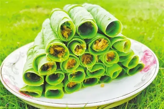 斑斓卷原是越南的一种点心,制作方法经台山归侨们不断改进,结合台山地方风味,从馅料构成、甜度、色泽、造型等方面进行创新,现在已成为当地的特色美点。斑斓卷这道美食,它的色泽如仲夏的鲜嫩绿草,它的味道清新香甜,让人难以忘怀。