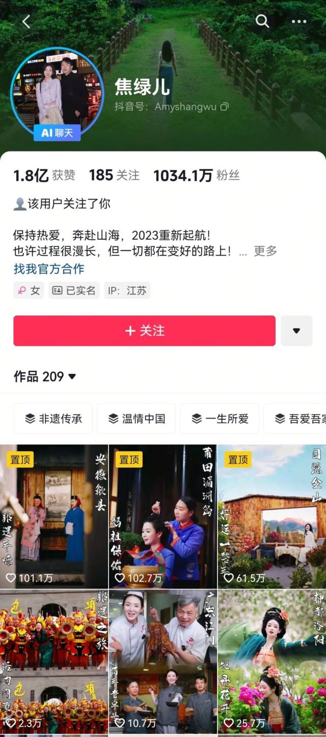 这正是焦绿儿作品的魅力之所在。作为文化领域头部自媒体创作者,焦绿儿全平台粉丝已突破千万大关。从主持人转型文旅博主,再到非遗传承者,焦绿儿以独特的视角将传统技艺与现代新媒体形式巧妙结合,用镜头语言让“老手艺”焕发新生,吸引数百万年轻人关注并爱上传统文化,为非遗文化的传播搭建起了一座桥梁,让更多人了解非遗、热爱非遗、传承非遗。除了非遗,她的内容还涉及文旅方面,以充满烟火气的画面去探索各地的风土人情、自然景观和人文景观等。