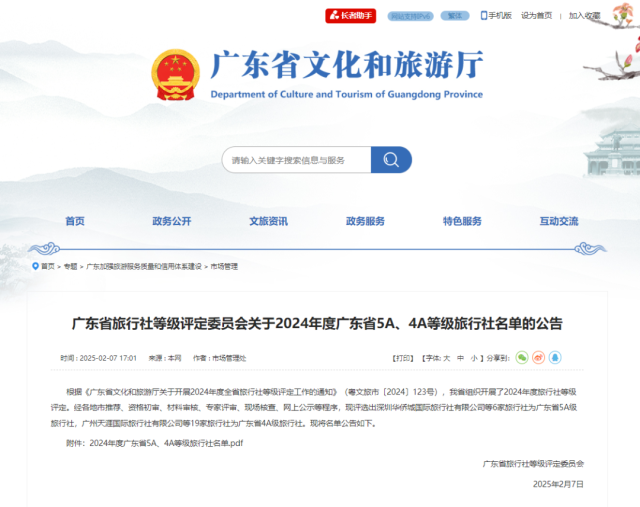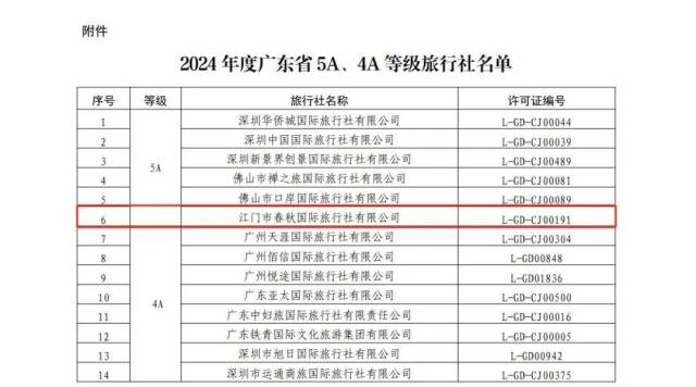 去年7月,广东省文化和旅游厅正式开展2024年度全省A级旅行社评定工作,市文广旅体局根据有关通知要求组织符合条件的旅行社进行申报工作,并于去年12月评选江门市教育旅行社等3家旅行社为广东省3A级旅行社。通过此次评选后,我市共有1家广东省5A级旅行社、3家4A级旅行社、14家3A级旅行社。