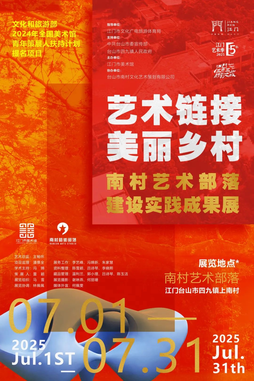 由江门市文化广电旅游体育局指导,中共台山市委宣传部、台山市四九镇人民政府支持,江门市美术馆主办,台山市南村文化艺术策划有限公司协办的“艺术链接美丽乡村——南村艺术部落建设实践成果展”于7月1日至31日在江门台山市南村艺术部落展出。该展入选文化和旅游部2024年全国美术馆青年策展人扶持计划提名项目,为第五届江门艺术季活动之一。