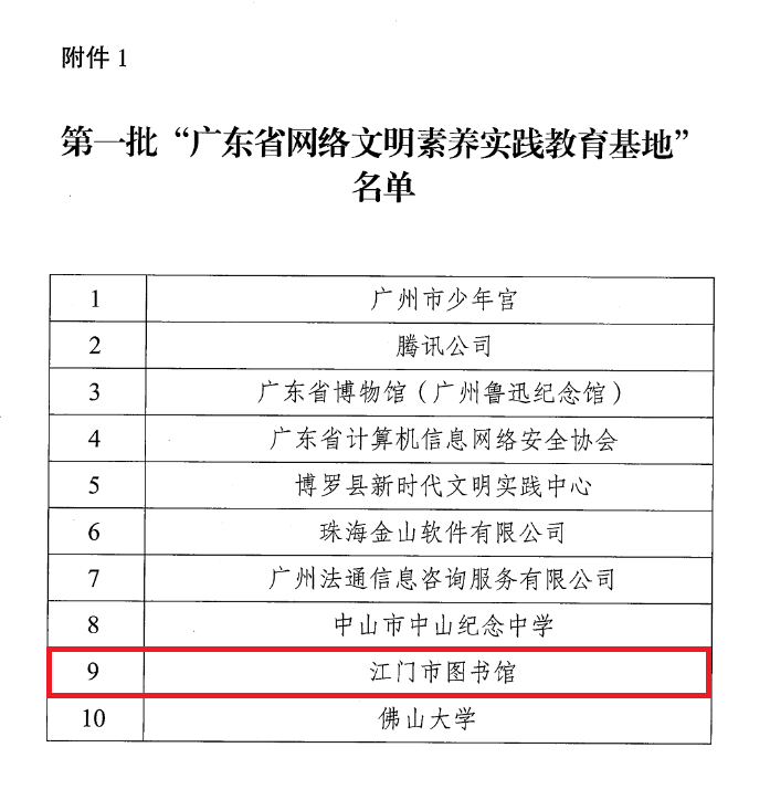 江门市图书馆入选第一批“广东省网络文明素养实践教育基地”,根据《关于印发第一批“广东省网络文明素养实践教育基地”名单及开展第二批基地申报工作的通知》粤委网办通【2025】42号文件江门市图书馆获批广东省网络文明素养实践教育基地!