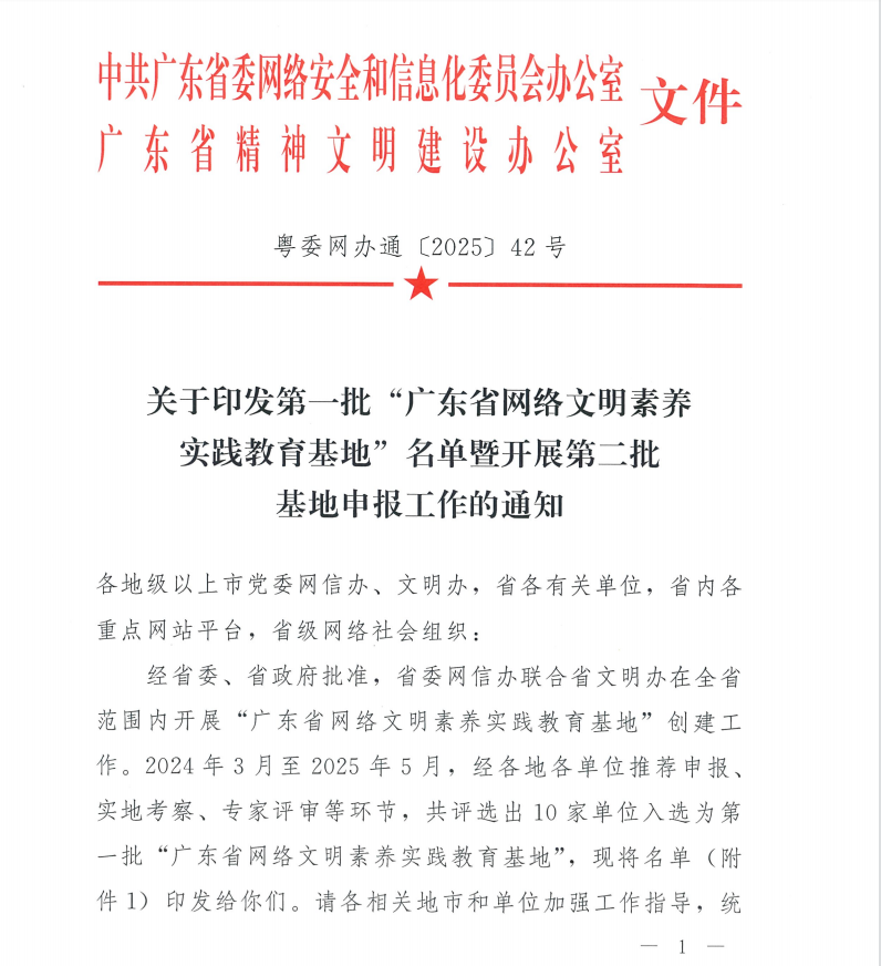经省委、省政府批准,省委网信办联合省文明办在全省范围内开展“广东省网络文明素养实践教育基地”创建工作。经各地各单位推荐申报、实地考察、专家评审等环节,评选出第一批(10家)“广东省网络文明素养实践教育基地”。