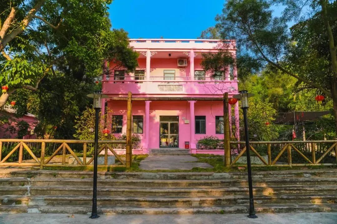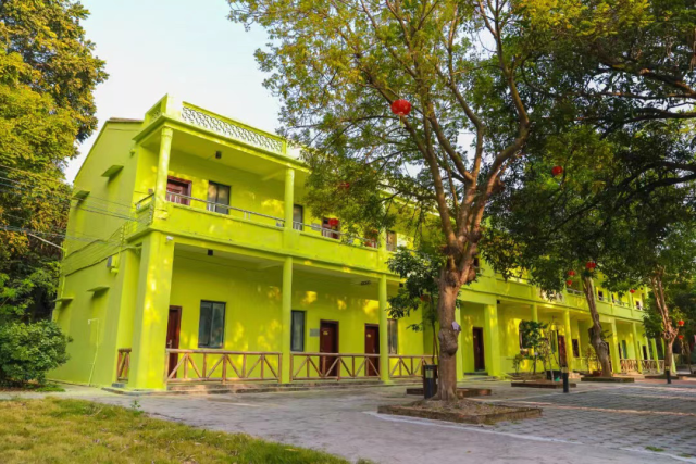 在新会区古井镇的慈溪村,郁郁葱葱的树林内,古井百年书香文化村和荷溪星舍客栈依山而立。