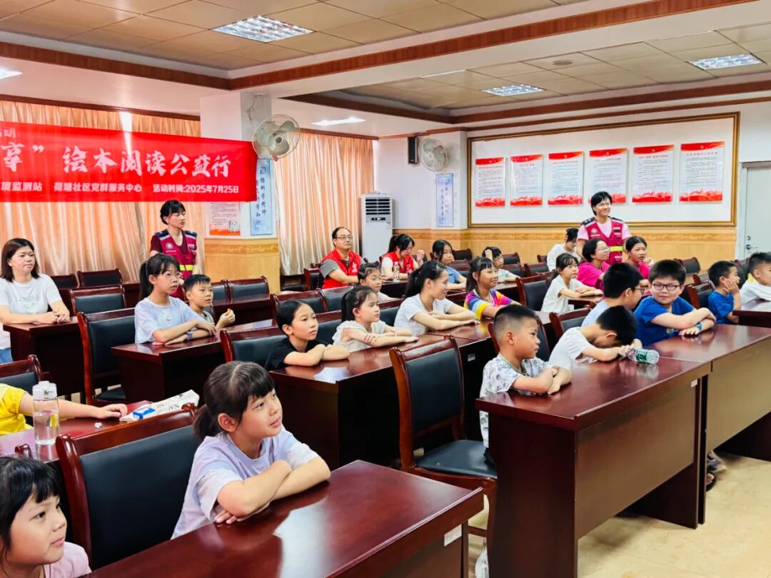 7月25日上午,由江门市图书馆携手广东省江门生态环境监测站、荷塘社区党群服务中心共同开展的 “小绘本 大分享” 绘本阅读公益行活动,在荷塘社区热闹开场。30名小朋友带着好奇与期待齐聚一堂,在生动的绘本故事讲述与趣味互动游戏里,悄悄播下环保的种子,也收获了满溢的知识与快乐。