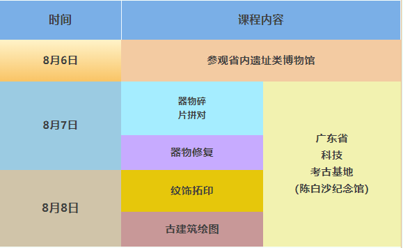欢迎加入广东省科技考古基地夏令营(二期)!本期考古夏令营我们以室内修复为主题,学习考古专家文物修复技能,体验考古学科的无限魅力! 本期考古夏令营内容 考古体验 活动报名注意细则 1.报名人数 20人(每个号码仅限一人报名) 2.报名时间 即日起至8月3日中午12时 3.活动时间 2024年8月6日~8月8日 4.招募对象 初中、高中、大学在校学生 5.活动地点 上课地点:广东省科技考古基地 (江门市陈白沙纪念馆) 参观地点:另行通知 备注:本期考古夏令营学员以走读形式参与,活动第一天集中出外参观学习,学员统一安排中午用餐外(当天往返);其余两天中午不统一安排。请学员们注意上学路上的安全。 报名方式:点击下方二维码进行报名,注:报名者留未成年姓名及年龄,电话请留家长的信息,成人可直接填写相关信息。报名后请将手机保持开机状态,成功报名者于2025年8月3日15:00-17:00将有专人电话通知,未收到电话通知即属报名不成功。 活动须知 1.本次活动属公益活动,请珍惜本次的活动机会。活动期间请提前10分钟到达活动现场。 2.如有事不能参加活动请提前致电3560075,工作人员将名额留给下一位爱好者。 3.活动期间请服从馆内工作人员的指引及安排,感谢大家配合。 4.本次活动为期连续3天,名额珍贵,过程中请勿随意请假、迟到。主办方不安排食宿(第一天午餐除外),请学员注意上学路上的交通安全。 5.活动最终解释权归江门市博物馆所有。