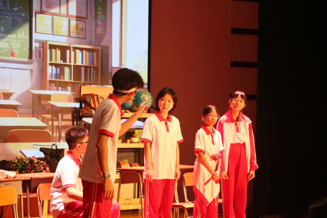 演出当晚,江门市文化馆二楼多功能厅,座位被精心策划布置的演出场景包围在中央,不少家长带着孩子早早到场等候。随着灯光渐暗,舞台上的 “教室” 、还有校园角落、球场等场景随着剧情360度环绕神秘铺开,一本关乎 “时代少年” 评选的《学霸密卷》瞬间将观众带入这场充满悬念的戏剧中:五个少年的命运因这场 “失窃案” 交织在一起,他们在学业重压、家庭期待与友情考验下的挣扎与呐喊,通过演员们的生动演绎,直抵观众心灵。