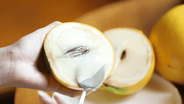 用勺子挖出果肉,咬上一口