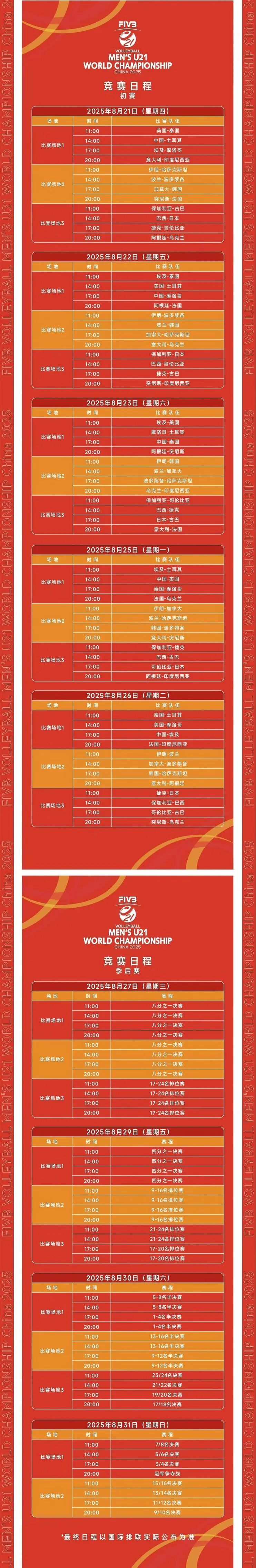 据赛事组委会介绍,本次锦标赛分为两个阶段进行。第一阶段为小组赛,24支队伍分为A、B、C、D四个小组展开单循环较量,各组前4名晋级16强。中国队位列A组,同组别的还有埃及、美国、泰国、摩洛哥、土耳其。第二阶段从8月27日起进入季后赛,依次进行八分之一决赛、四分之一决赛(8月29日)、半决赛(8月30日),最终的冠军争夺战将于8月31日上演。