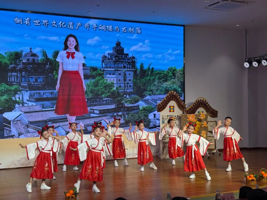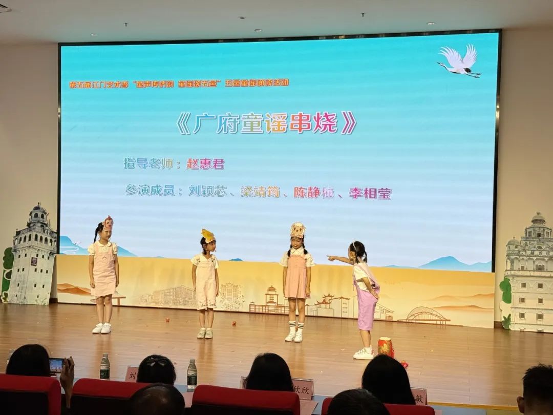 台山晨曦童言队以《台山欢迎您》展现侨墟风情与滨海韵味;恩平童谣队用《恩平烧饼谣》传递非遗美食背后的人文故事;江门有戏剧团少儿团《童谣诵五邑・童声展乡韵》,用清澈纯净的童声,将五邑大地的深厚文化底蕴以及淳朴人文风情细细铺展。各队伍将江门、台山、开平、恩平、鹤山的地域风情浓缩于歌声之中,全方位展现五邑侨乡 “一域一韵、全域共美” 的文化风貌。