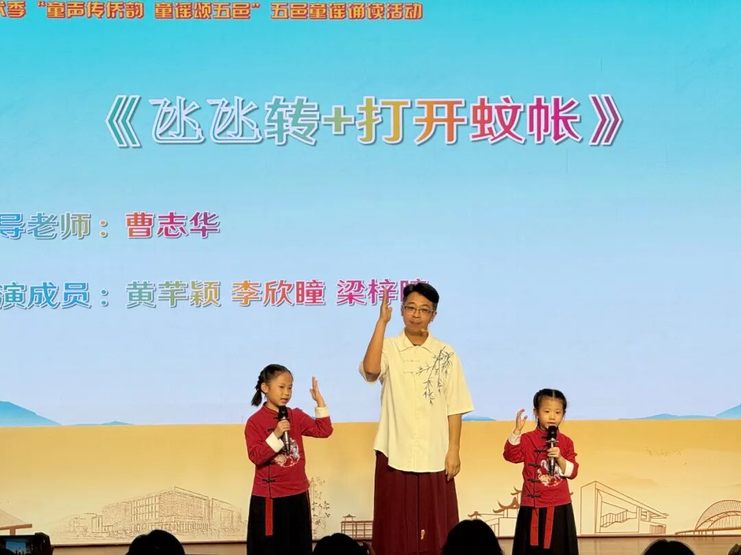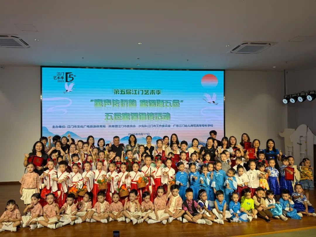童声承文脉,侨韵润侨乡,2025年8月17日由江门市文化广电旅游体育局、共青团江门市委员会、少先队江门市工作委员会、广东江门幼儿师范高等专科学校联合主办,江门市图书馆、江门市青少年宫、广东江门幼儿师范高等专科学校图书馆共同承办的 “童声童趣” 五邑童谣诵读展演活动在江门市图书馆隆重举行,来自五邑地区的14支队伍为在场的200多名观众奉献精彩的童谣诵读表演。