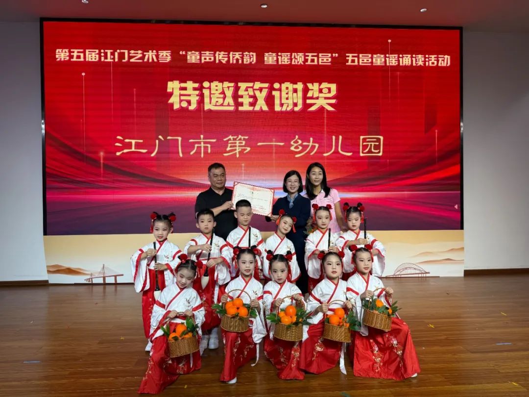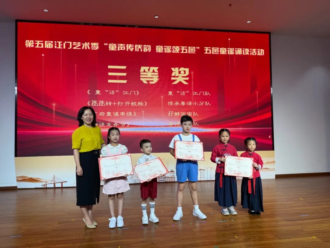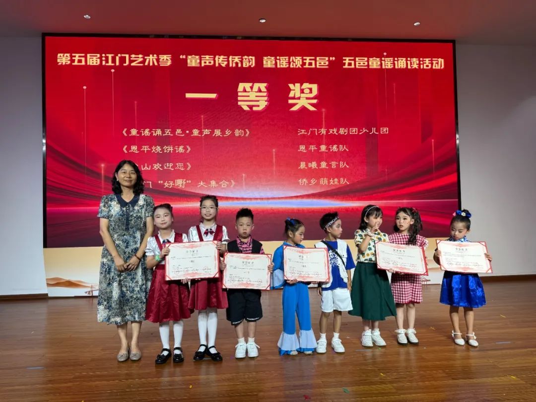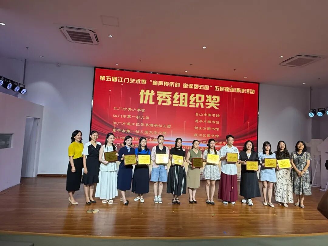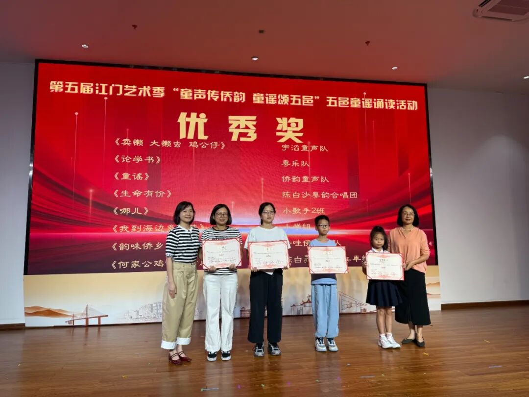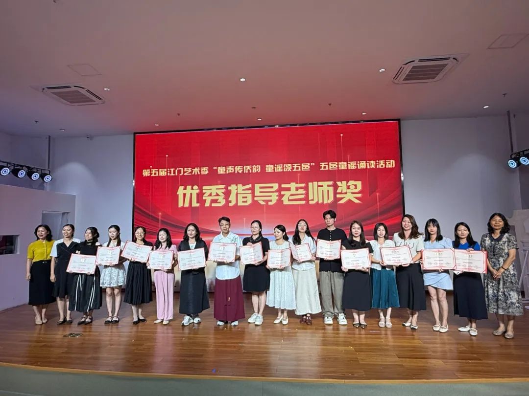 展演结束后,活动举行隆重颁奖典礼,对在此次展演中表现突出的团队、个人及支持单位进行表彰 —— 授予优秀作品一、二、三等奖及优秀奖,表彰曹志华等 17 名 “优秀指导老师”,授予江门市蓬江区紫茶博学幼儿园等 12 家单位 “优秀组织奖”,并为江门市第一幼儿园颁发 “特邀队伍感谢奖”。领导嘉宾为获奖代表颁奖,以表彰先进、树立标杆,激发全社会参与侨乡文化传承的积极性。