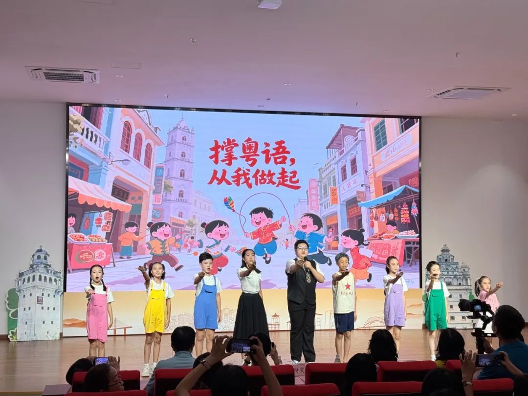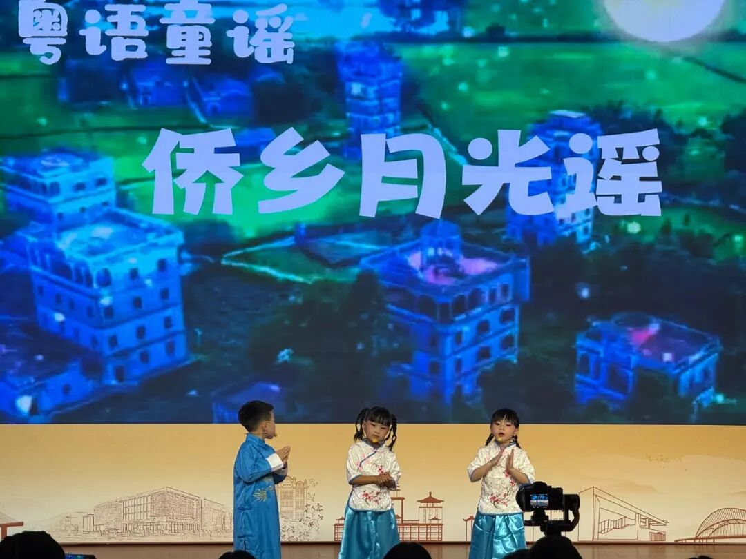 传承粤语小分队演唱《氹氹转 + 打开蚊帐》,熟悉旋律唤醒几代人共同的童年记忆;侨乡月光队吟诵《侨乡月光谣》,以细腻声线传递游子思乡情愫,让 “乡愁” 这一文化符号在童声中更具感染力,筑牢侨乡儿女的文化情感纽带;粤语萌娃队带来的《童说粤语》他们用独特的视角和纯真的演绎,展现粤语文化的独特魅力;五邑谣童声队带来的《氹氹转之五邑童谣》每一个童声的吟唱,都是对五邑历史的回望,对家乡风土人情的礼赞。