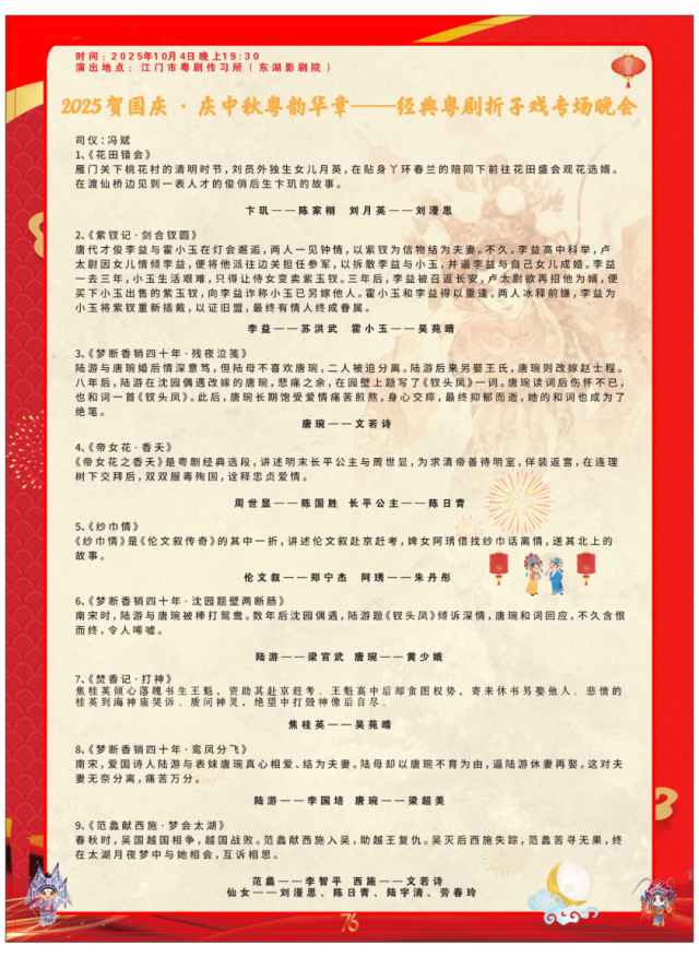 演出场次精彩丰富,门票数量有限,先到先得,欢迎各位观众朋友届时前往江门市粤剧传习所(东湖影剧院),共度一个充满粤韵风情的国庆、中秋佳节!