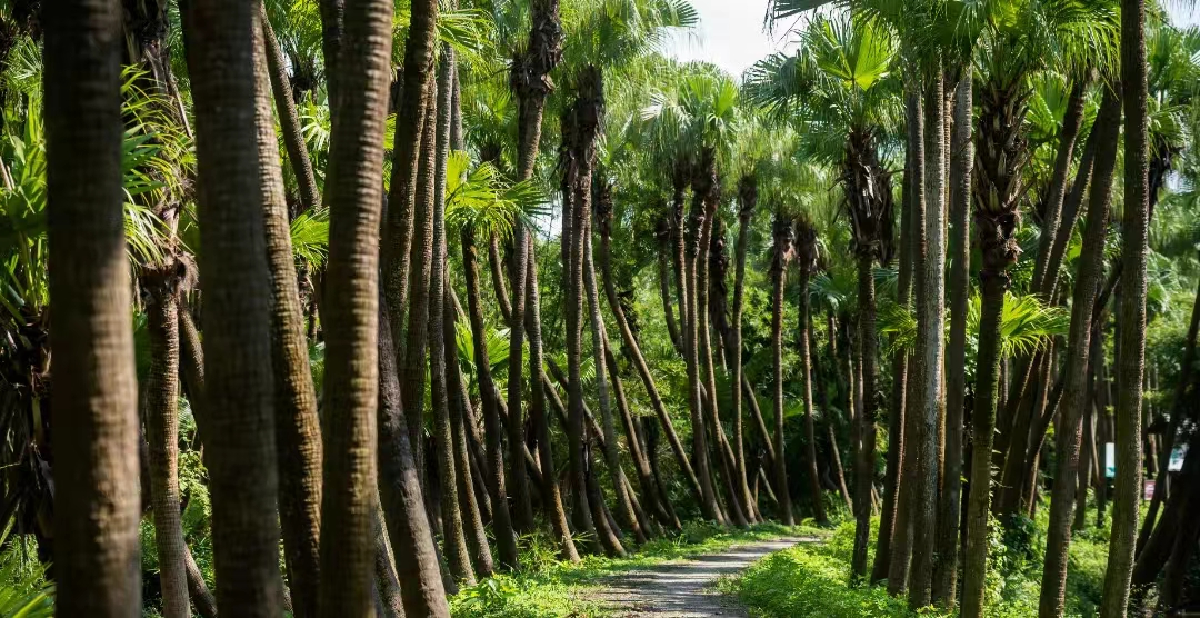 林间蒲葵姿态各异,漫步于林间小径,目光所至皆是浓郁翠绿,野趣盎然,仿佛置身于绿野仙踪的童话世界。每当风吹过,宽大的葵叶随风摇曳,沙沙作响,仿佛大自然在低语,阳光透过葵林,洒下条条光柱,灵动美好。
