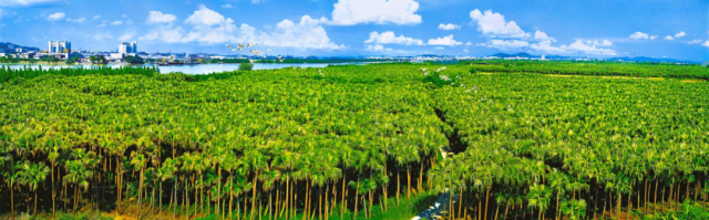 位于南坦岛的南坦葵林生态湿地公园种植有1500多亩蒲葵林,是新会乃至全国唯一一片保存较完整的连片葵林。从高处鸟瞰,犹如一块“绿翡翠”。