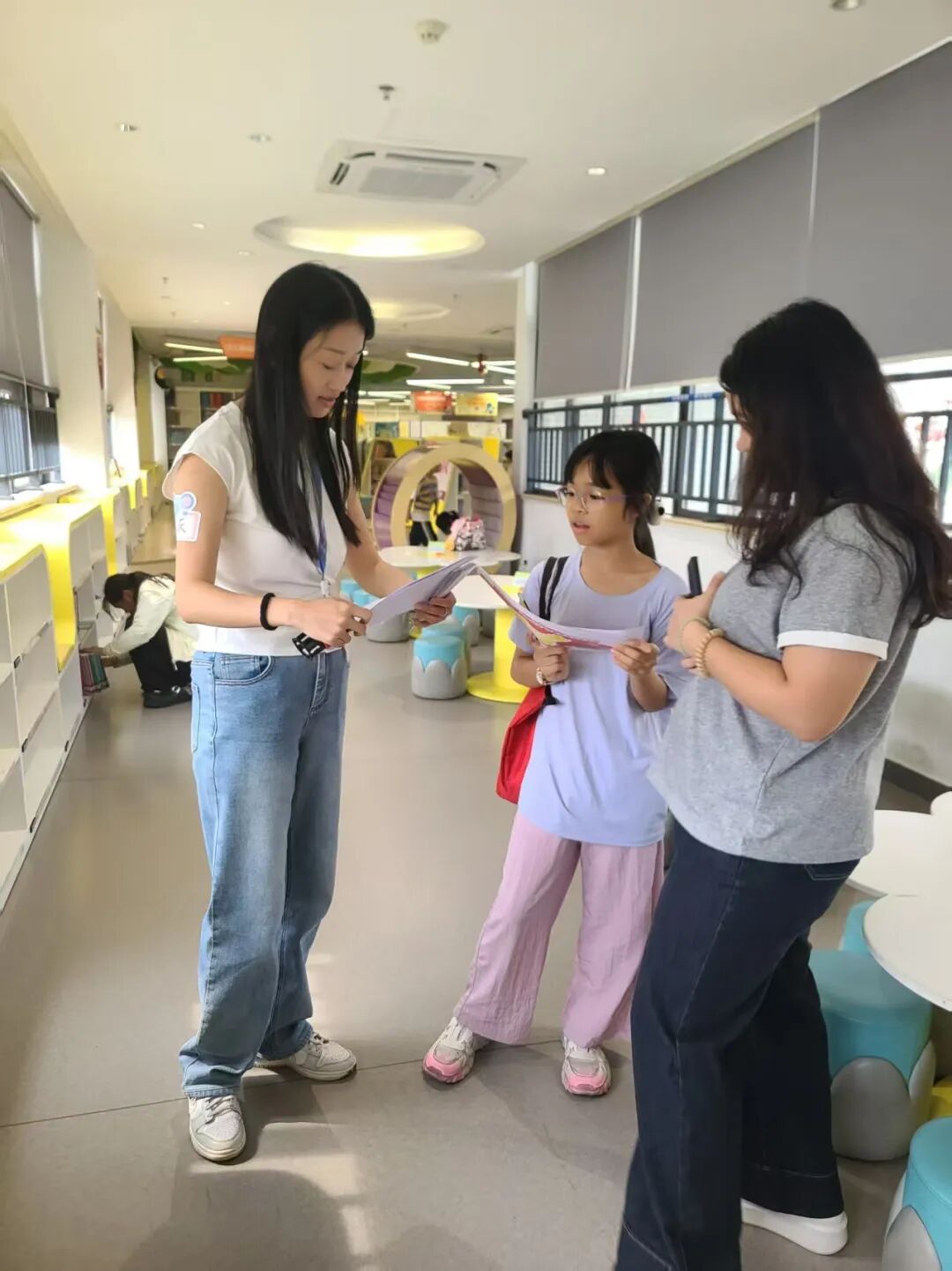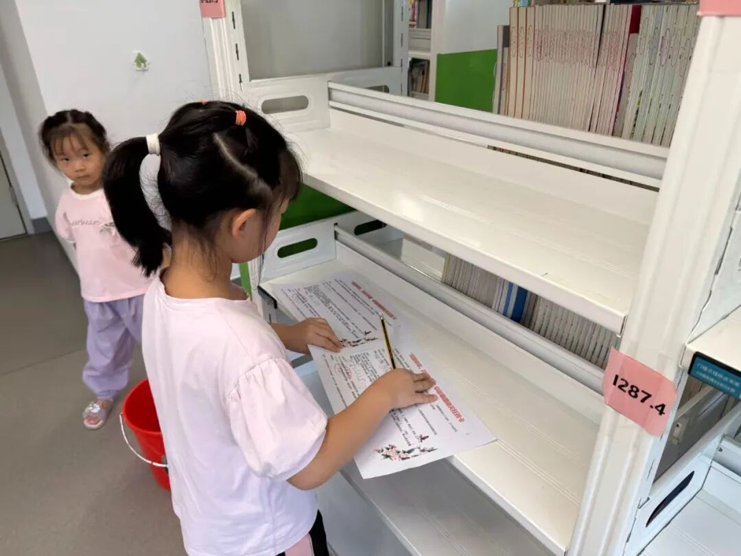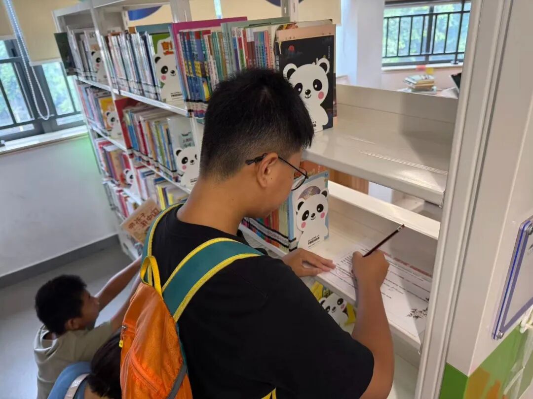 在三个关卡的参与过程中,小读者们全程沉浸在自主探索的乐趣里:面对对应中国七大地理区域的固定关卡,他们捧着任务卡穿梭在少儿部,找到站点后或迅速落笔写下熟悉的答案;开启找书关卡时,大家按任务卡提示前往三楼“少儿社会科学书库”,循着索书号在书架间像“寻宝”般查找指定书籍,找到后专注翻至规定页数答题;而在流动关卡环节,孩子们睁大眼睛在少儿阅读区搜寻双肩贴“国庆快乐”贴纸、挂工作牌的地理引导员,抽到任务卡后自信完成互动,盖到纪念章的瞬间,脸上满是雀跃的笑容,每一关都让他们在动手与思考中收获了独特的参与体验。