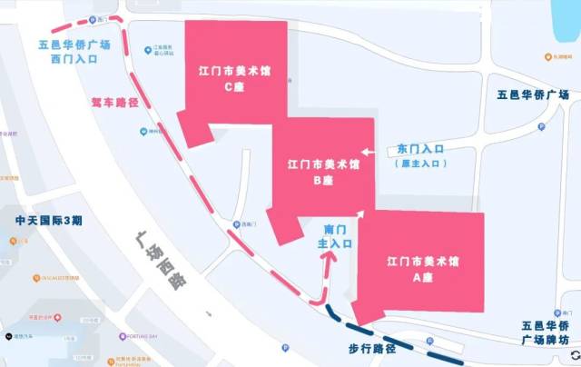 江门市美术馆-南门主入口位置参考:由江门市五邑华侨广场西门入口处右转前行约200米即可抵达,此处正对中天国际3期,与华侨广场公交站直线距离约100米。
