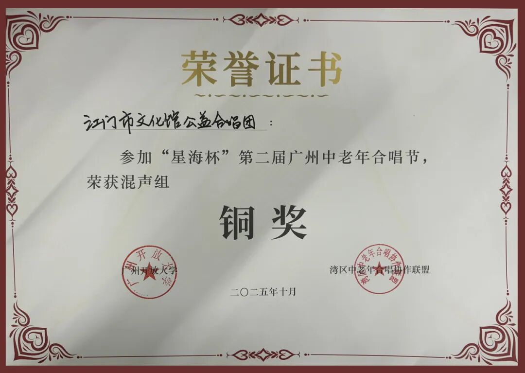 近日,以“湾区会知音 银龄唱华章”为主题的“星海杯”第二届广州中老年合唱节在广州圆满落幕。作为粤港澳大湾区标杆性中老年艺术赛事,本届汇聚全国60余支优秀合唱队伍角逐,33支复赛晋级团队中仅20支闯入决赛。江门市文化馆公益合唱团虽仅成立一年多,且混声组男声仅5位,仍凭借《满城烟花》《松花江上》的精彩演绎,在强手如林中斩获混声合唱铜奖,为江门合唱事业书写新篇。