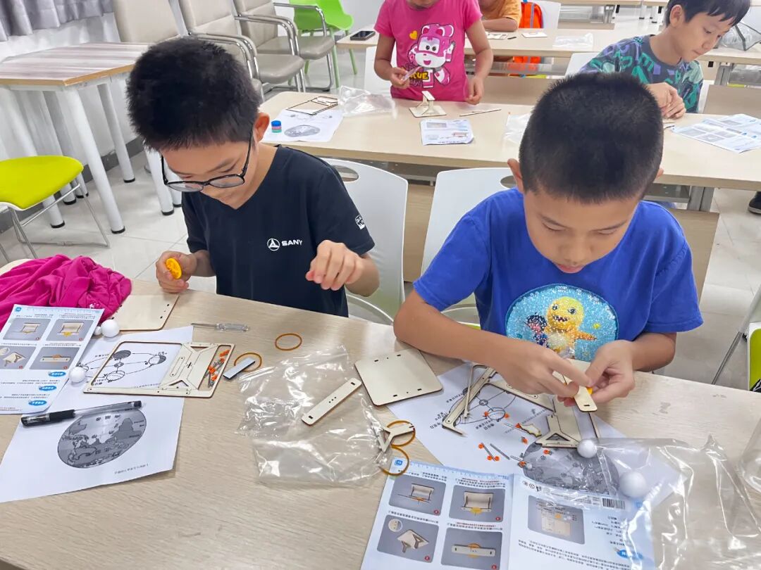 “地球自转一圈要多久呀?”“为什么白天会变成黑夜呢?”活动一开始,小朋友们的问题就像小泡泡一样冒了出来。在志愿者老师的引导下,孩子们先是围在地球仪旁,观察地轴倾斜的角度;随后通过组装“日地月三球仪”动态模型,跟着演示模具模拟地球“自西向东”的转动,直观看到“地球自转”如何带来昼夜交替、太阳东升西落的现象。