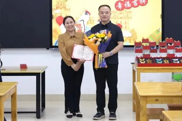 开平市碧桂园学校副校长朱小琳为“镇濠泥鸡制作技艺”的非遗代表性传承人冯永勇颁发“优秀讲师”证书