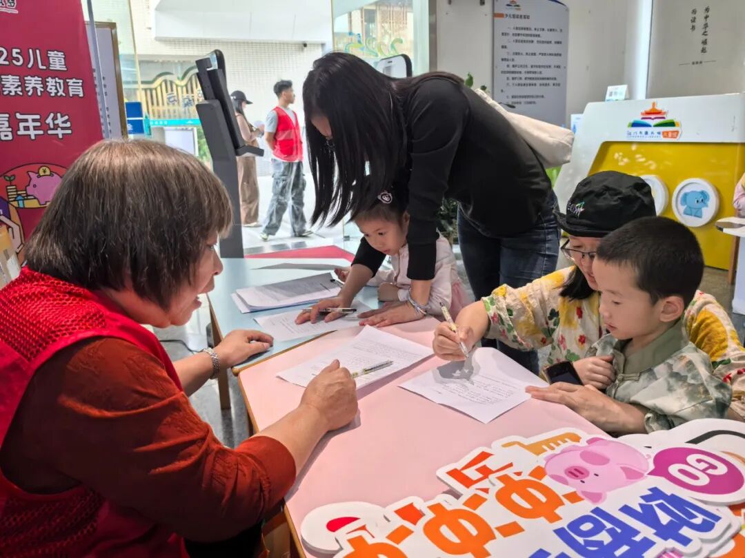 技能区的“财智问答”“识币比拼”项目前参与人数众多。孩子们手持钱币图案卡片认真思考,遇到疑问时与家长轻声探讨,充分体现了亲子互动的温馨氛围。