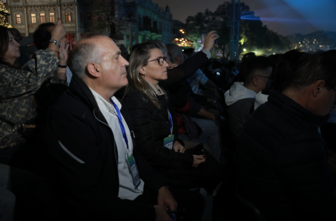 在赤坎华侨古镇,在工作人员的带领下,葡萄牙旅行商团坐上铛铛车穿梭于古镇的骑楼街巷,在欣赏充满艺术人文气息的特色建筑之余,共同观看了《归途》《火秀》等精彩演艺,沉浸式触摸侨乡文化的“温度”。