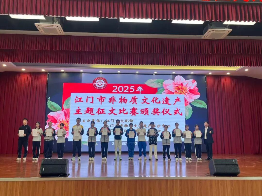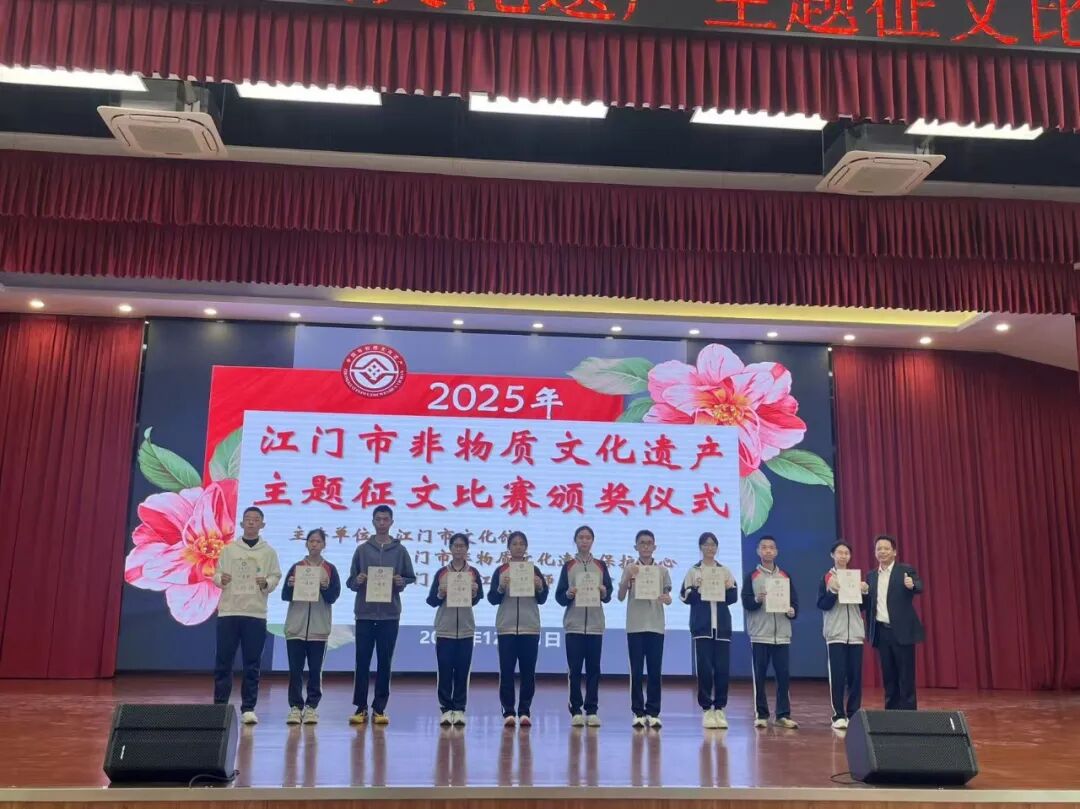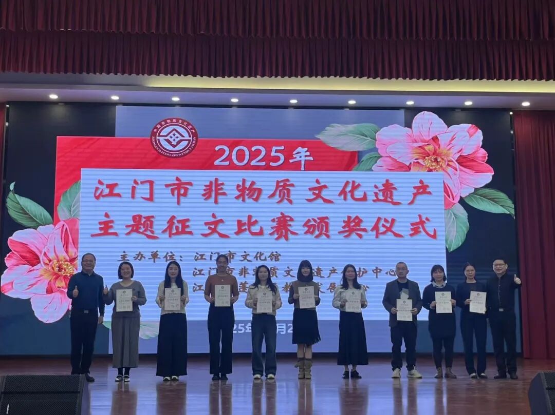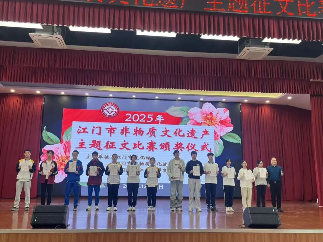 2025年12月21日上午,由江门市文化馆、江门市非物质文化遗产保护中心、江门市蓬江区教师发展中心共同主办的“2025年江门市非物质文化遗产主题征文比赛”颁奖仪式在江门市蓬江区陈垣中学隆重举行。本次活动旨在弘扬侨乡非遗,让非遗深入民心、深入校园,让广大市民和在校师生了解江门侨乡的非遗魅力。