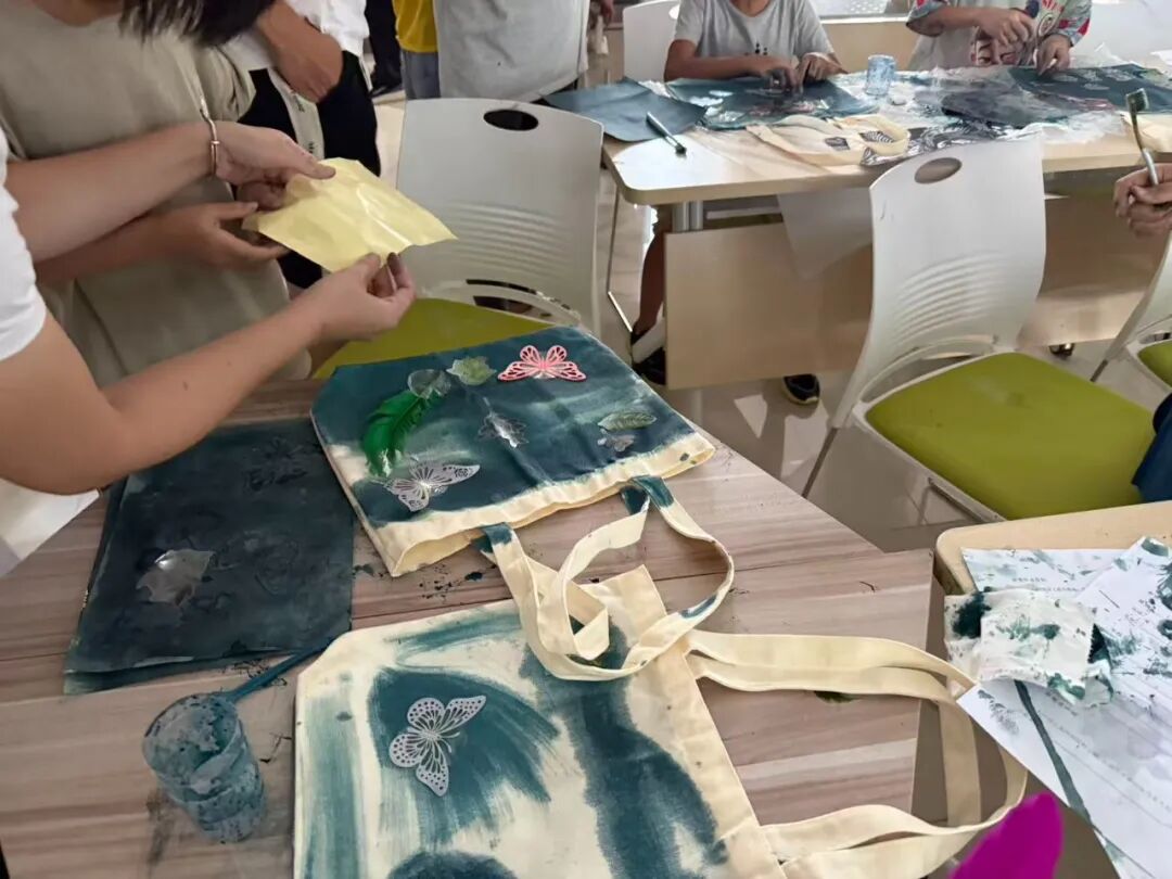 在蓝晒创作课程中,孩子们拾取林间叶片、草茎,排列于涂布蓝晒试剂的纸张。经阳光照射,纸张发生光化学反应,晕染出靛蓝色调。孩子们借此体验光影艺术,传承古法摄影工艺。成品中,靛蓝底色上自然素材纹理清晰,每道纹路都诉说着自然与人文交融的故事,成为传统文化传承的生动见证。