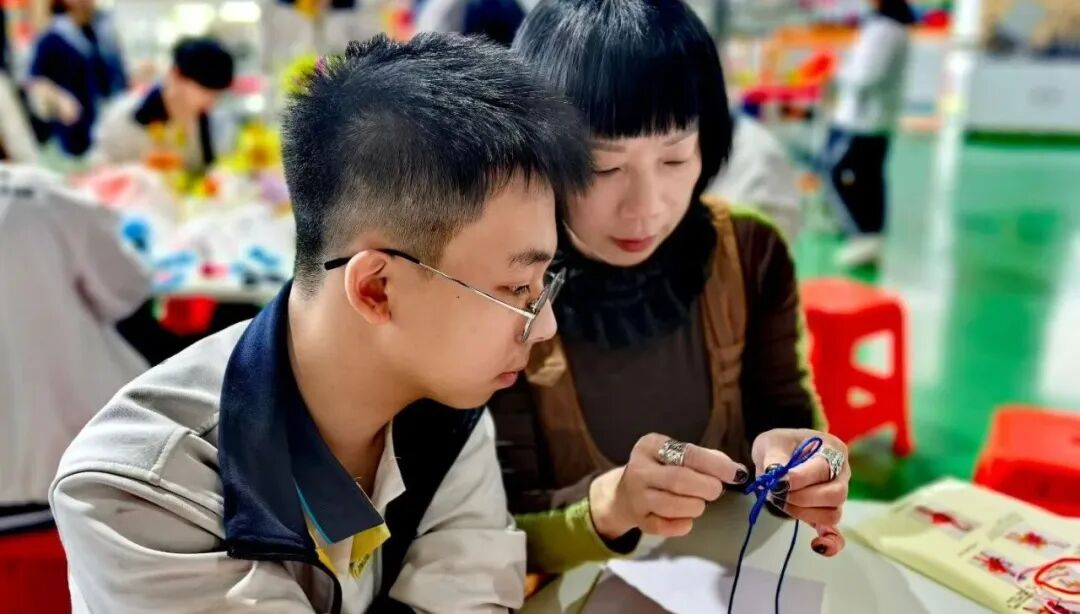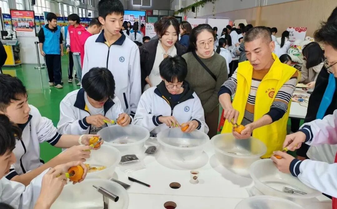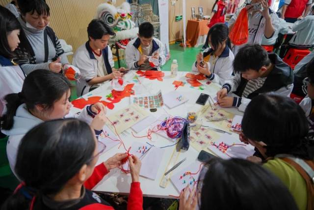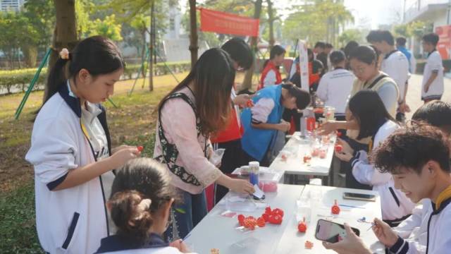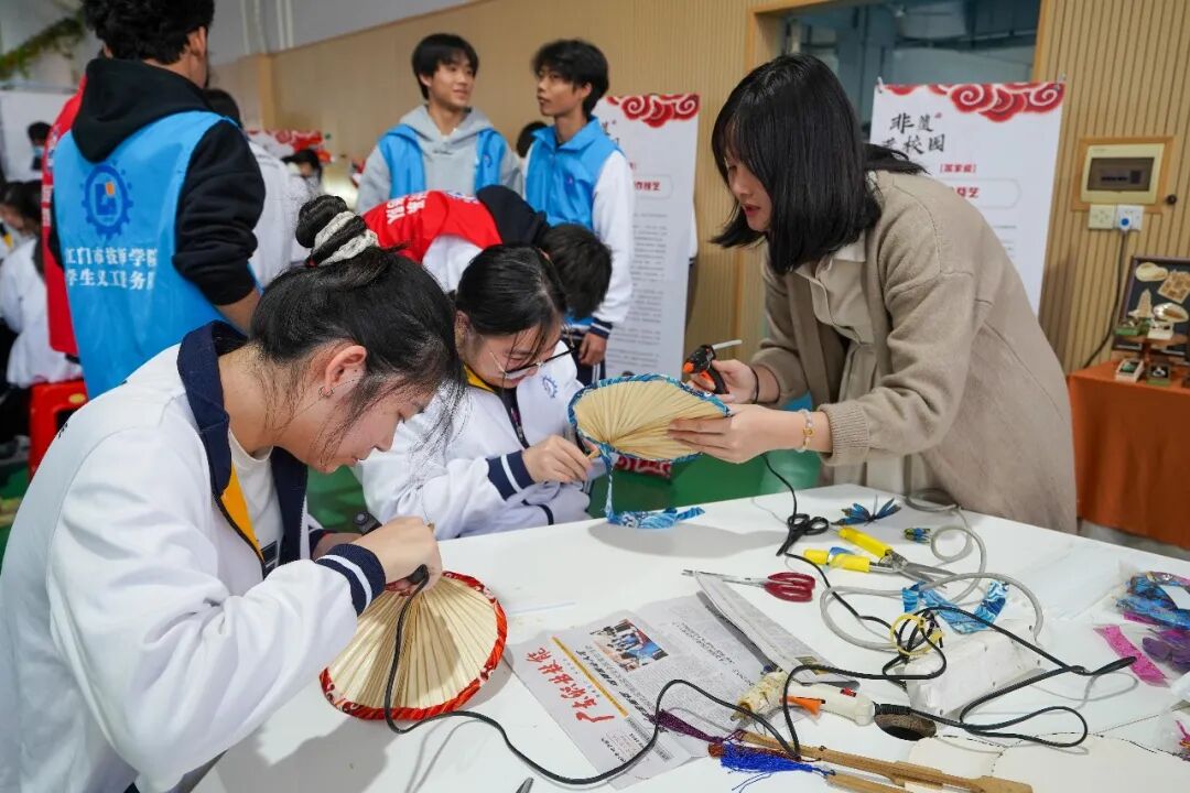 江门市文化馆、江门市非物质文化遗产保护中心精心打造的非遗互动体验市集同步开市,集中展示了新会葵艺、罗氏柑普茶制作技艺、外海生恭鲤鱼手工艺品等12个本地特色非遗项目。传承人近距离面对面展示精湛技法,手把手教学生们动手实操,在指尖互动中感受传统工艺的匠心魅力。市集还设置文创展示区,将非遗元素与现代设计相结合的特色产品,让学生直观感受非遗在新时代的生命力。