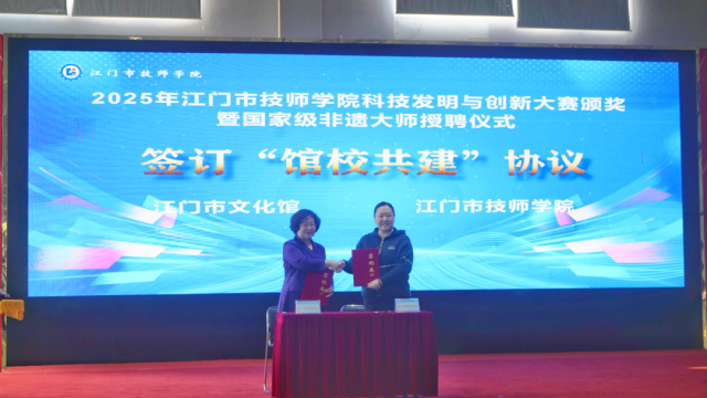 12月30日,江门市文化馆与江门市技师学院联合举办的馆校共建签约暨国家级非遗大师授聘仪式顺利举行。活动以 “传承非遗文脉、深化法治教育、共育技能人才” 为核心,通过签约合作、大师授聘、非遗市集、识法献言有奖问答四大板块,构建起 “文化+教育+法治” 的协同育人新生态,为侨乡文化传承与校园育人工作注入强劲动力。