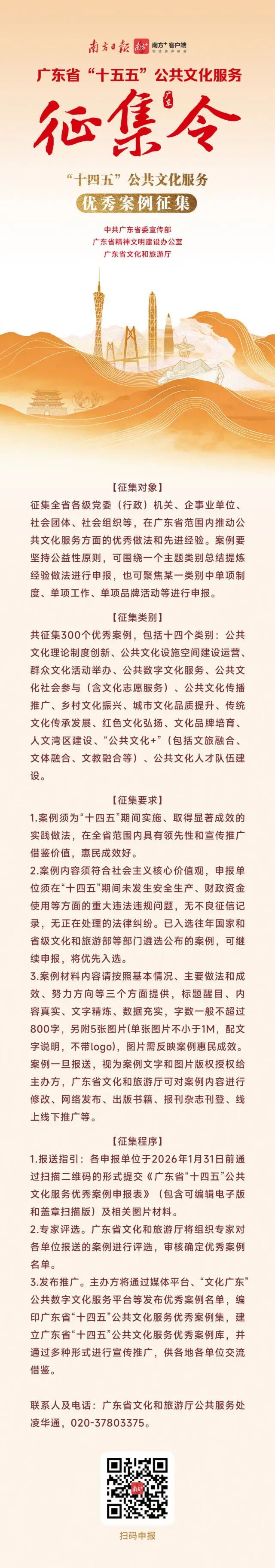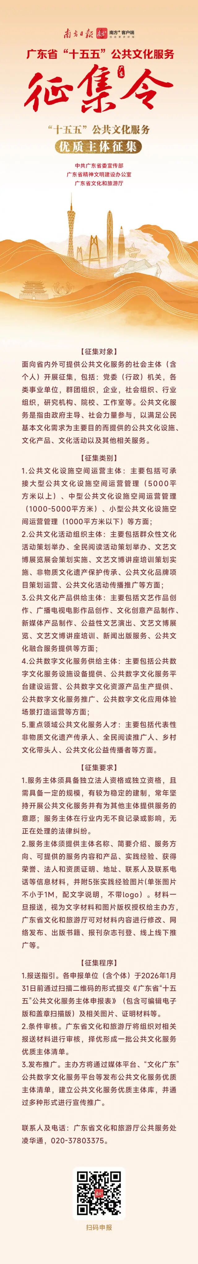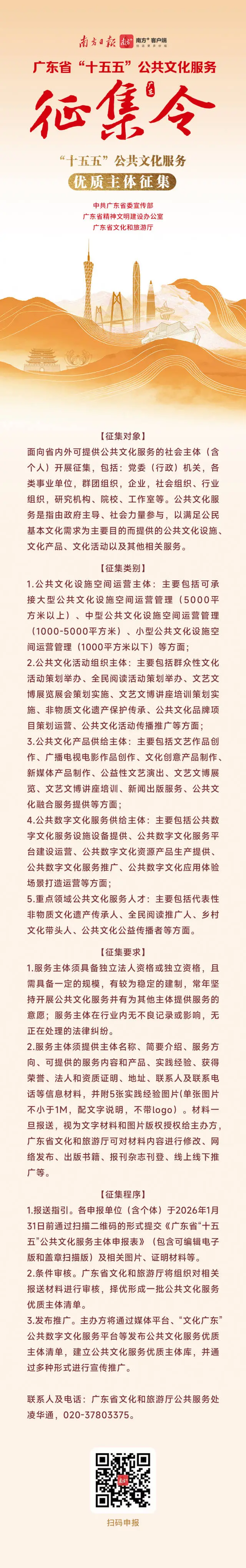 12月31日,中共广东省委宣传部、广东省精神文明建设办公室、广东省文化和旅游厅向全社会正式发布一项重要活动:广东省“十五五”公共文化服务“征集令”,将于2026年1月1日起,全面启动“十四五”公共文化服务优秀案例征集与“十五五”公共文化服务优质主体征集活动。