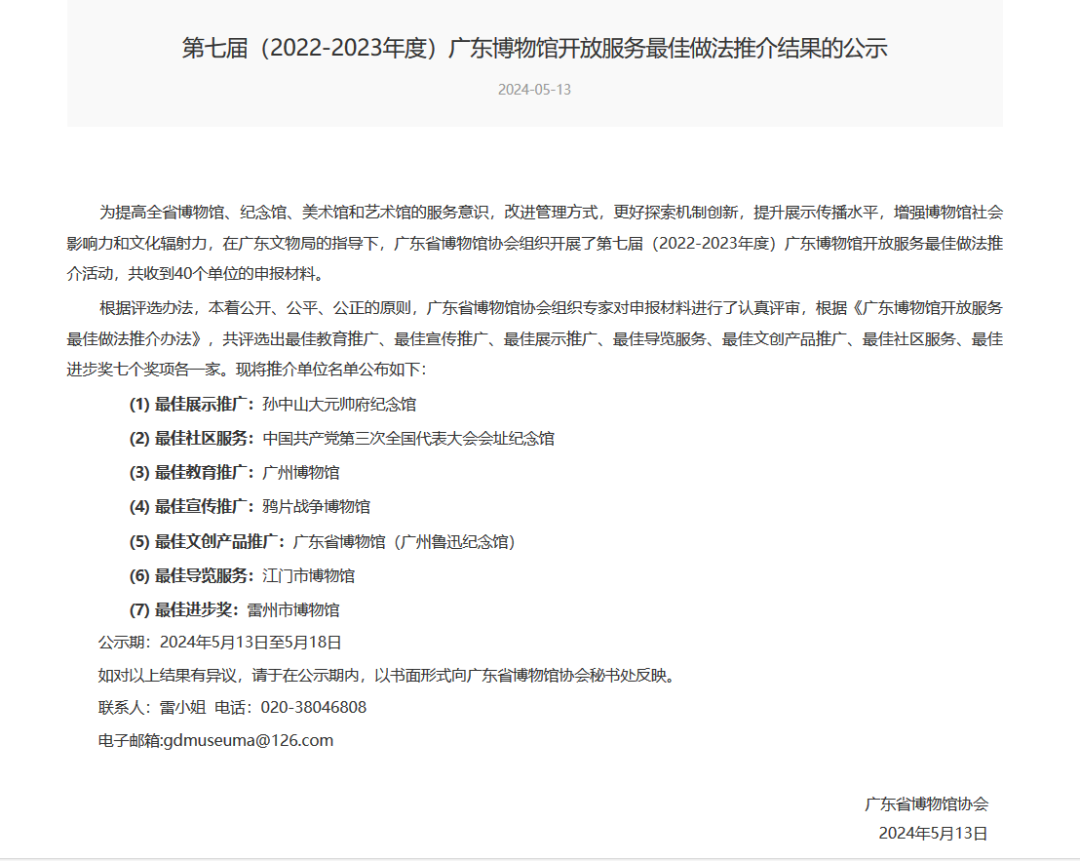 日前,在广东文物局的指导下,广东省博物馆协会组织开展了第七届(2022-2023年度)广东博物馆开放服务最佳做法推介活动,共评选出最佳教育推广、最佳宣传推广、最佳展示推广、最佳导览服务、最佳文创产品推广、最佳社区服务、最佳进步奖七个奖项各一家。