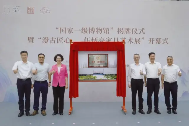 6月15日,“国家一级博物馆”揭牌仪式暨“澄古匠心——伍炳亮家具艺术展”开幕式在中国侨都华侨华人博物馆举行。市长吴晓晖出席活动并宣布展览开幕。广东省工艺美术协会会长、广东省广轻控股集团有限公司董事长戴智,广东省文化和旅游厅博物馆与社会文物处一级调研员孙旭亮,广东省博物馆协会理事长、省博物馆副馆长陈邵峰参加活动。