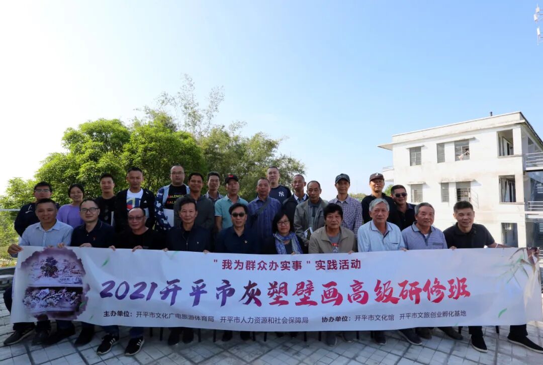 开平市民间文艺家协会,成立于2016年,坚持以民间文艺服务人民的宗旨。协会现有从事灰塑制作的成员8人,各展所长,互鉴互学,形成了一支高水平的开平灰塑传承队伍。他们在塑型领域各具特色,胡旭亮擅长山水,谢建扶擅长文样,司徒伟洪擅长瑞兽,花鸟、虫鱼、山花分别是邓国权、邓春晖和关永健的拿手题材,张化冰在人物题材占一席之地,冯如豪擅长博古。成员们在传承和传播开平灰塑中均发挥积极作用,提高了开平灰塑的可见度,得到当地民众的广泛认可。