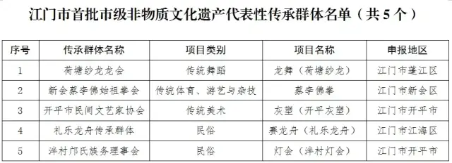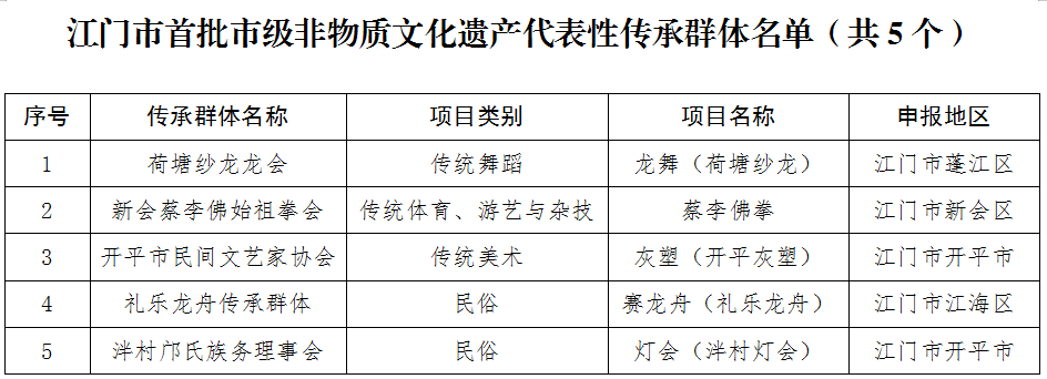 为将具有广泛群众基础、掌握精湛技艺的人选推荐出来,推动建设一支能够切实发挥示范带动作用、促进非遗赓续传承的市级非遗代表性传承人队伍,根据《中华人民共和国非物质文化遗产法》《广东省非物质文化遗产条例》《广东省省级非物质文化遗产代表性传承人认定与管理办法》等有关规定,日前,市文广旅体局组织开展了首批市级非物质文化遗产代表性传承群体申报评审工作,经各县(市、区)推荐、申报、市非物质文化遗产保护工作专家委员会专家评审组评审、专家委员会主任委员会议审议、局党组会研究、公示等程序,确定了江门市首批市级非物质文化遗产代表性传承群体名单(共5个)。
