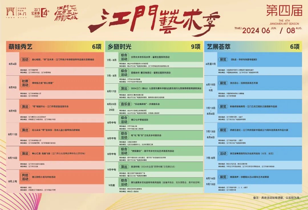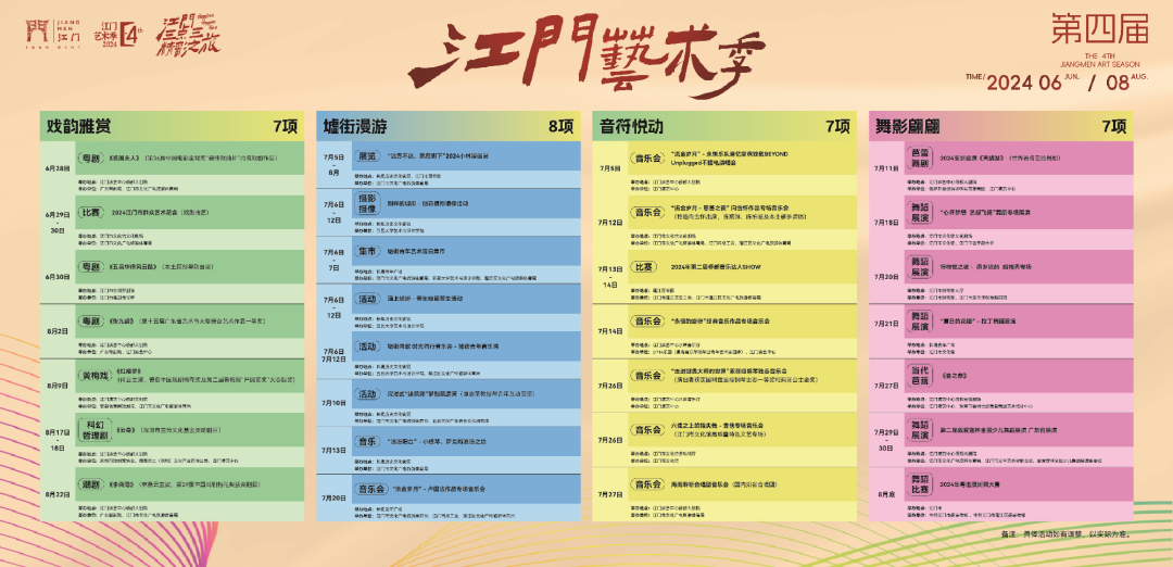 第四届江门艺术季由江门市人民政府主办,中共江门市委宣传部、江门市文化广电旅游体育局、江门市文学艺术界联合会承办,精选50项重点活动,分为“戏韵雅赏”“墟街漫游”“音符悦动”“舞影翩翩”“萌娃秀艺”“乡旅时光”“艺展荟萃”七大板块,将国内外艺术名团、名剧、名家汇聚一堂,系列原创歌曲、原创戏剧、原创舞蹈、原创展览争奇斗艳,充分展现了“侨都向新、文化提质”的文化艺术新景象。