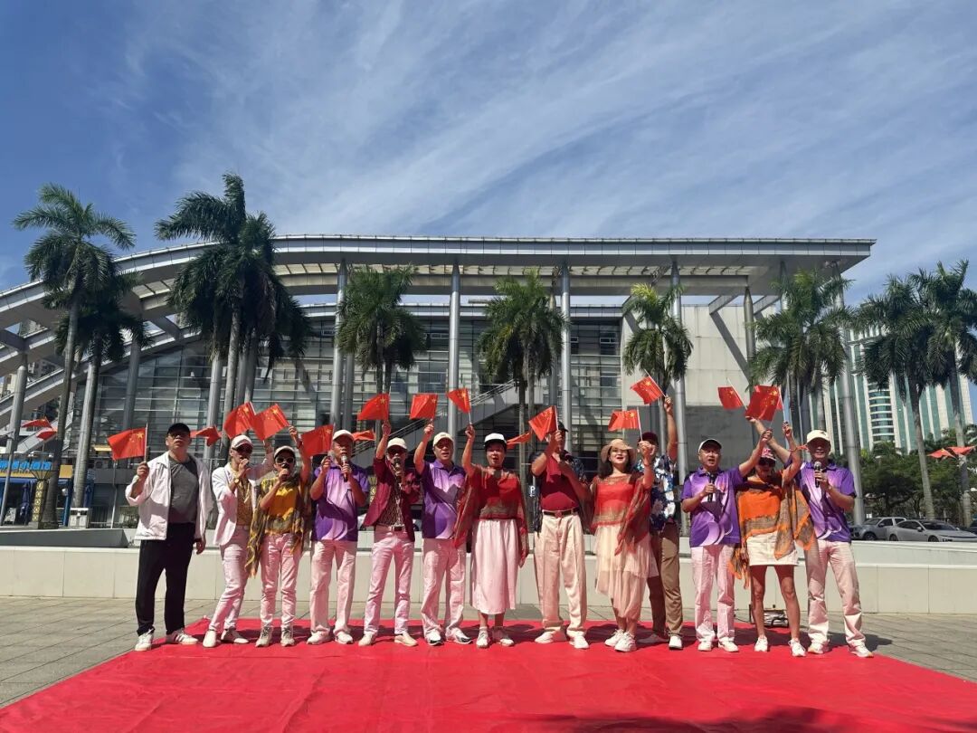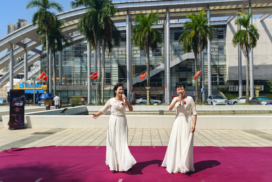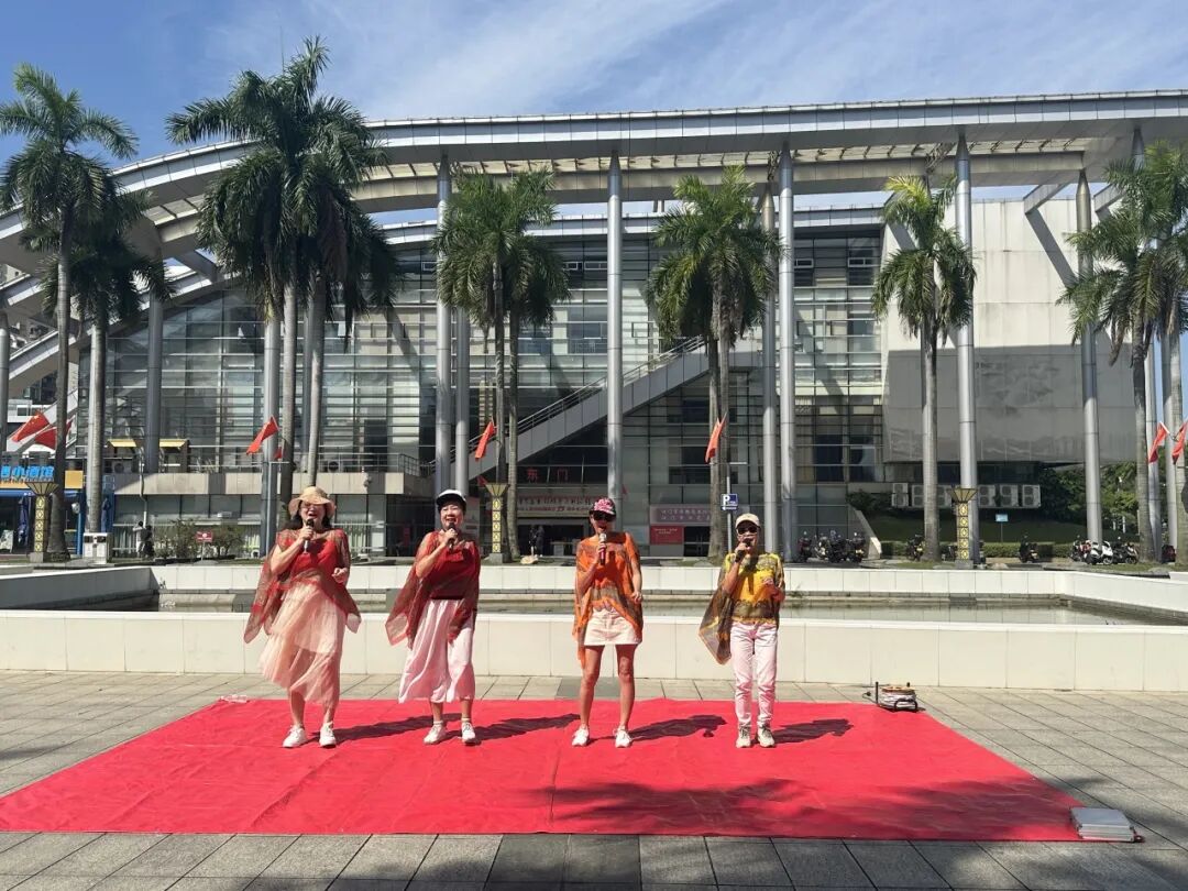 10月3日上午,江门市文化馆文化志愿者团队——声韵艺术团以一首充满浓郁新疆风情的“网红”歌曲《苹果香》开启了第三天的演出,深情的旋律辉映着广场上迎风飘扬的五星红旗,美好的场景动人心魄。演出先后呈现了《说中国》《我们的生活比蜜甜》《唱支山歌给党听》《想你的时候问月亮》《相思河畔》等经典歌曲,表达了侨乡人民对党、对祖国、对家乡的深情厚意,引起了观众的强烈共鸣。