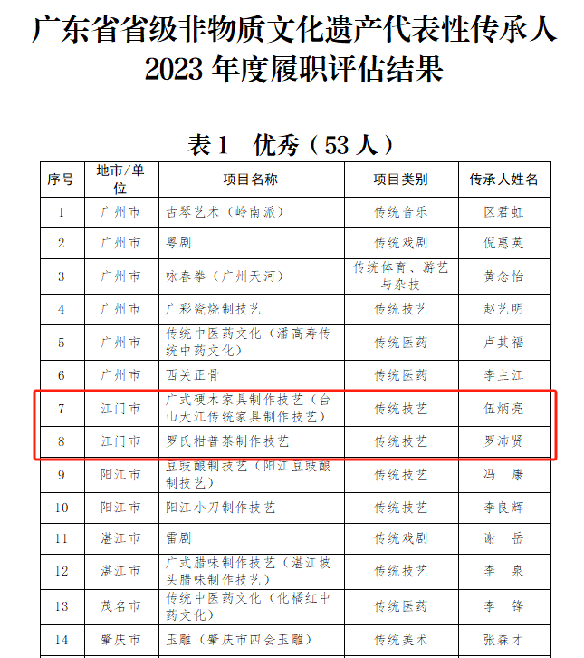 近日,广东省文化和旅游厅公布了省级以上非物质文化遗产代表性传承人2023年度履职评估工作情况的通报。全省参评的530位省级非物质文化遗产代表性传承人中,53人被评为优秀,465人被评为合格,10人被认定丧失传承能力,2人取消资格。我市广式硬木家具制作技艺(台山大江传统家具制作技艺)代表性传承人伍炳亮、罗氏柑普茶制作技艺省级代表性传承人罗沛贤2023年度履职评估优秀。