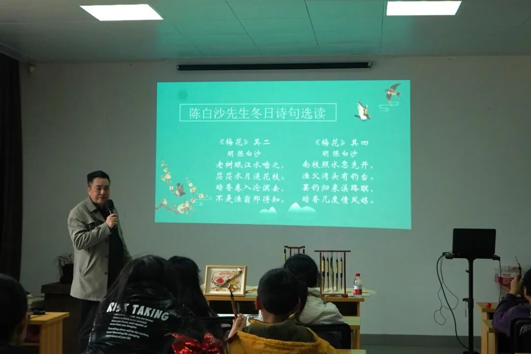 为了迎接即将到来的冬至,主办方还特地挑选出陈白沙先生所作的有关冬日的诗句进行诵读。在张瑞亨老师的指导下,由学员尝试体验用茅龙笔即席挥毫这些诗句。经过训练,每人完成一幅完整的书画作品,学员们也亲身体会到这个非遗项目的内涵与魅力!