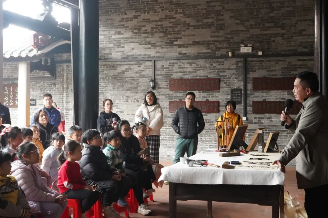 随后,学员们来到陈白沙祠贞节堂,张瑞亨老师向学员们介绍了国家级非遗项目白沙茅龙笔制作技艺的历史文化渊源和发展现状,并现场示范讲解了茅龙笔的书写特色和使用技巧。