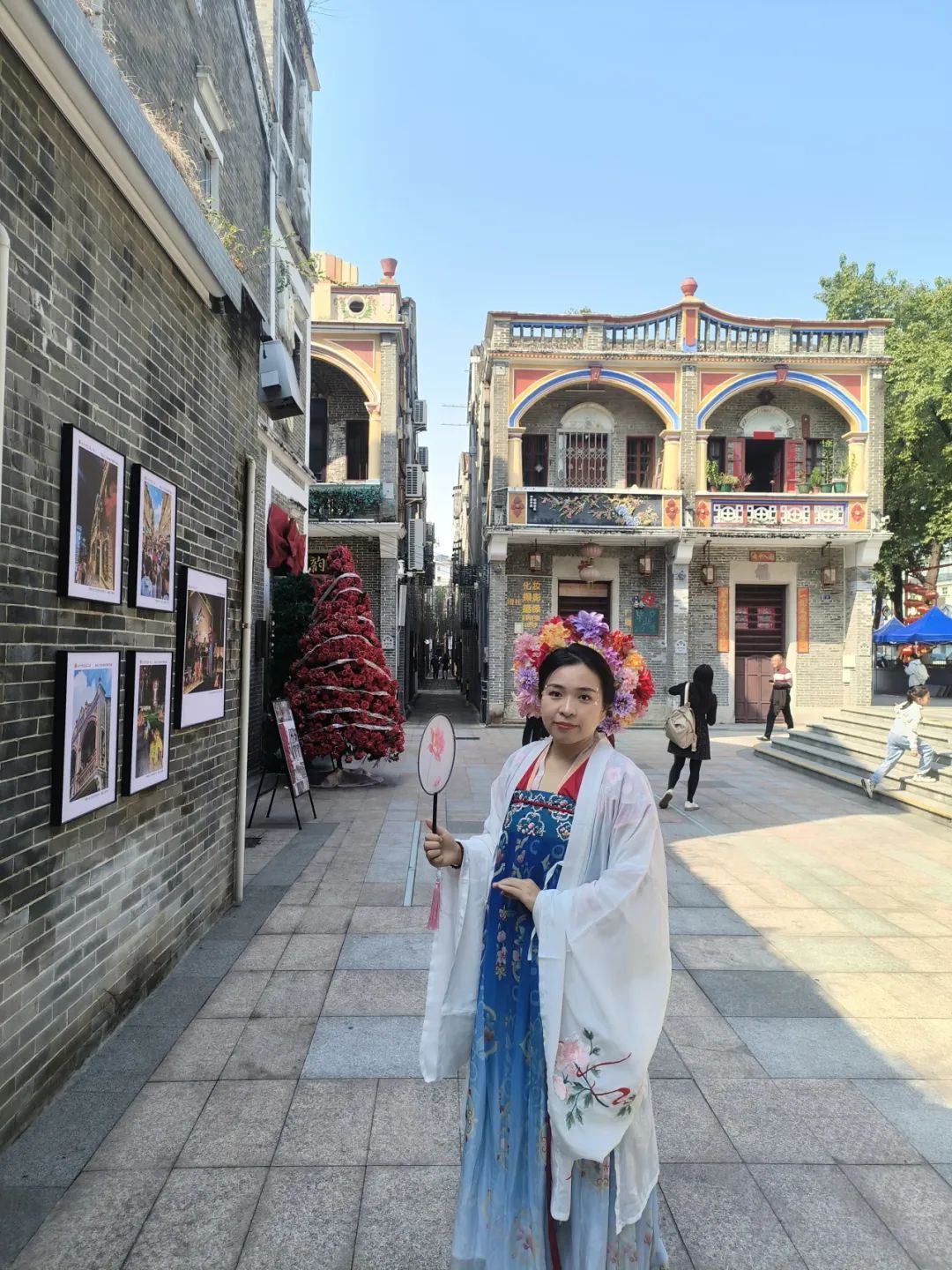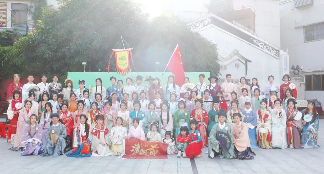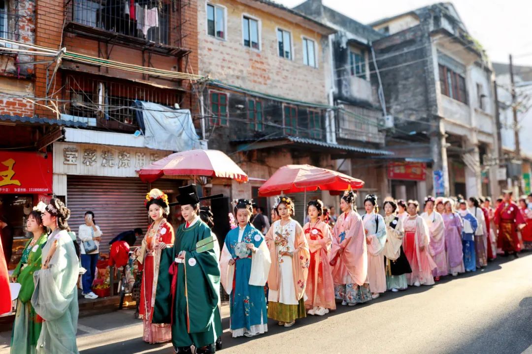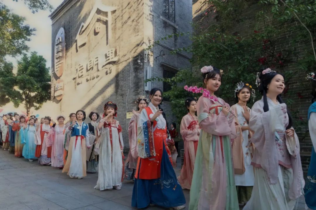汉服巡游:江门汉服•尚夏汉文化、拾庆园、五邑大学国学社联合召集了近百名汉服爱好者参与街区汉服巡游活动。现场,爱好者们穿着秦、魏晋、南北朝、唐、宋、明等朝代的汉服各具特色的汉服,与启明里古朴的风貌相得益彰,就像一幅流动的历史画卷,让人们仿佛置身于历史的长河之中。