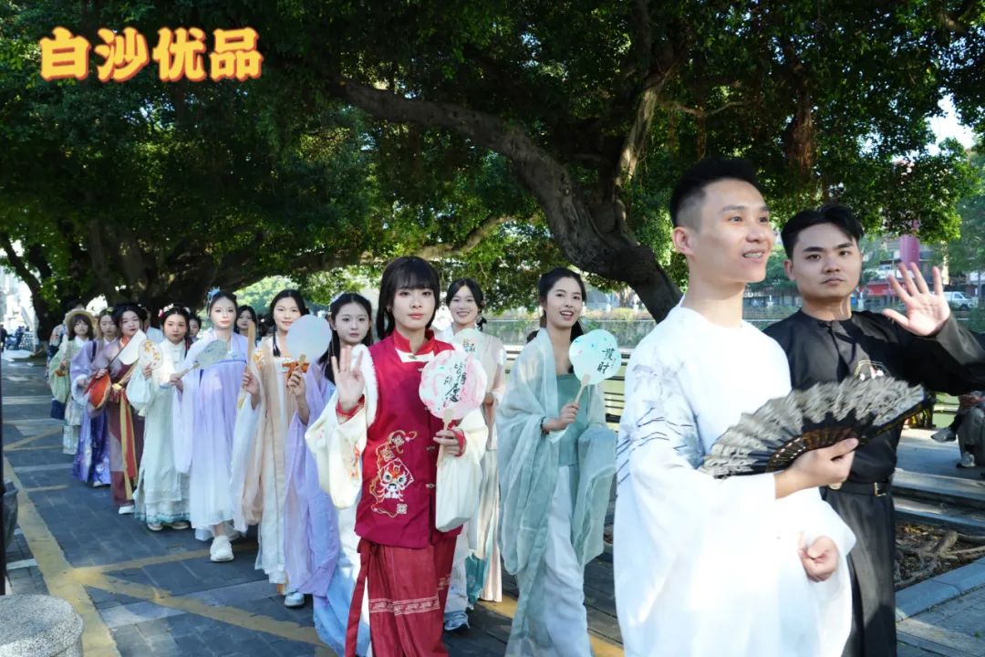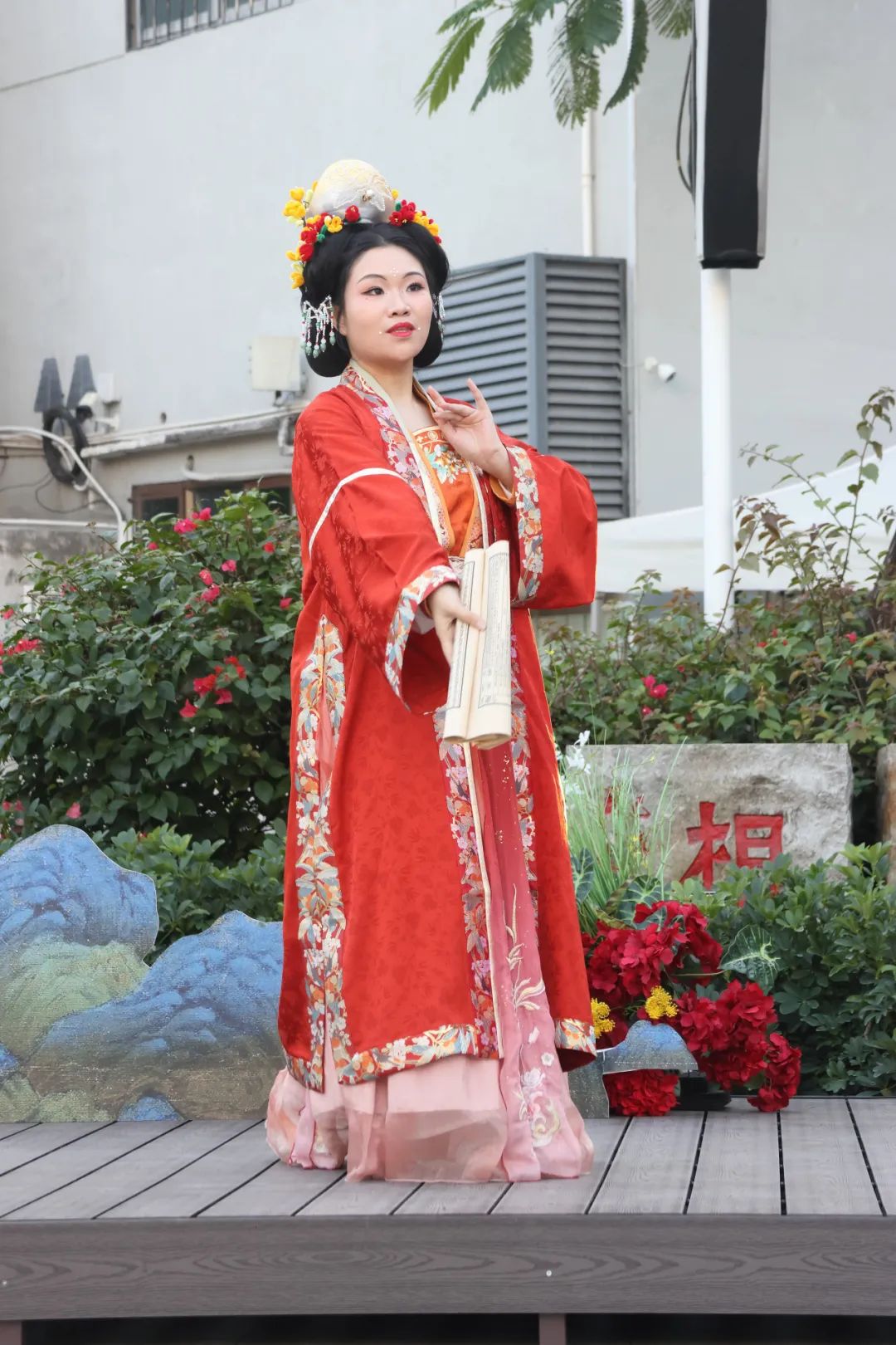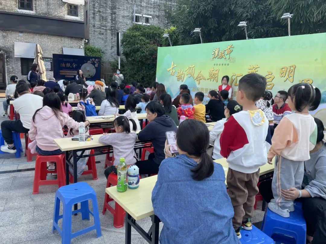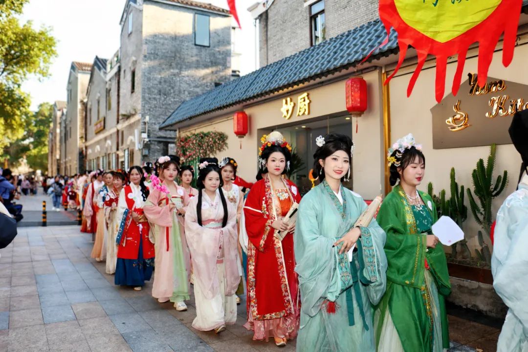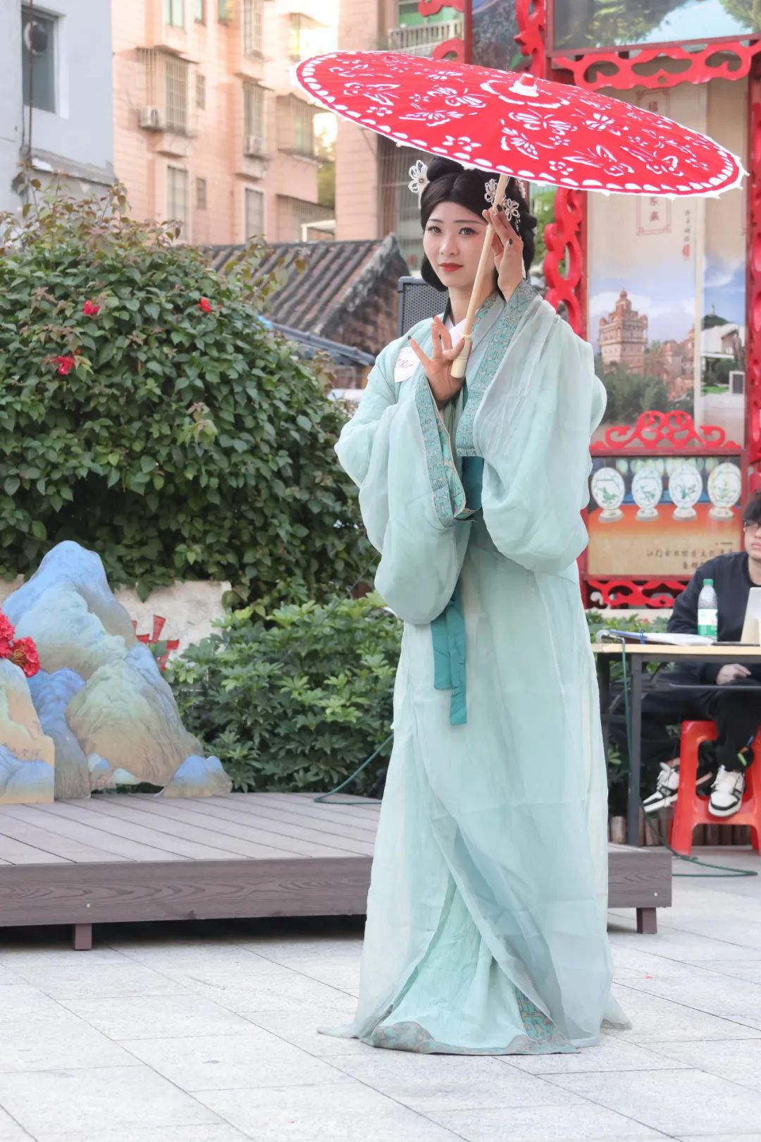 汉服走秀:来自五邑大学、江门汉服•尚夏汉文化的汉服爱好者们身着各个朝代特色鲜明的汉服,轻盈地穿梭在启明里广场和大街小巷。大家仿佛能看到古代文人雅士的翩翩风采,在现代的时空里重现。