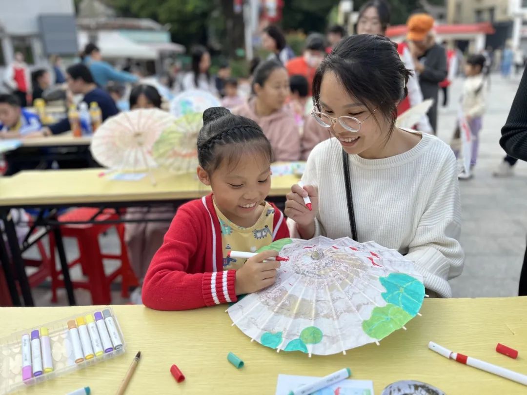 飘漆油纸伞:飘漆工艺是中国传统工艺之一,历史可以追溯到唐朝。它是一种在物体表面着色的装饰技艺,通常用于制作宫殿、房屋和器具等。油纸伞不仅仅是雨具,更是中国传统手工艺品的代表。活动现场组织了数十对亲子队伍,在老师的教导下沉浸式体验非遗文化飘漆制作工艺,为油纸伞赋予了独特的美感和文化意义。