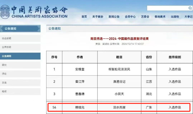 2024年12月14日,由中国美术家协会、 中共常州市委宣传部主办的“南田秀逸——2024·中国画作品展”复评工作结束。经专家评审,最终评出196件入展作品,江门市美术家赖培允的作品成功入选本次展览。